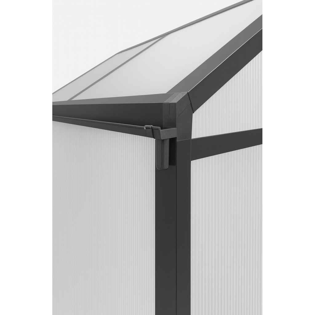Takuuaika 24 kkRunko on valmistettu kestävästä alumiinista ja seinät sekä katto ovat hyvin valoa läpäisevää 4 mm polykarbonaattilevyä. Nylonista valmistetut kulmakappaleet vähentävät kasaamiseen tarvittavaa ruuvimäärää, helpottaen ja nopeuttaen kasaamista merkittävästi. Rungon sivuilla on räystäskourut veden ohjaamiseen ja talteenottoon. Katossa on yksi säädettävä tuuletusikkuna ja kasvihuoneen ovi aukeaa ulospäin. Mukana yksityiskohtaiset vaiheittaiset kasausohjeet.