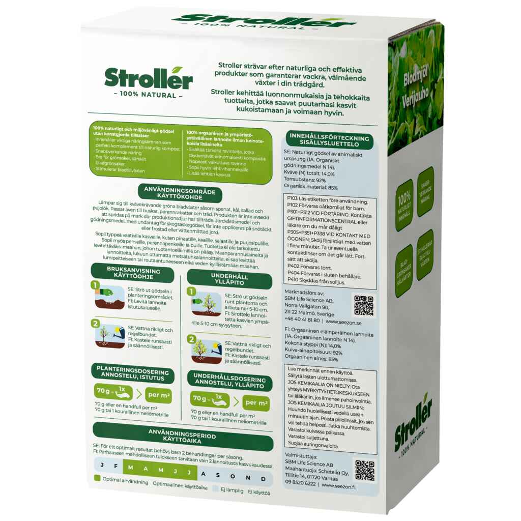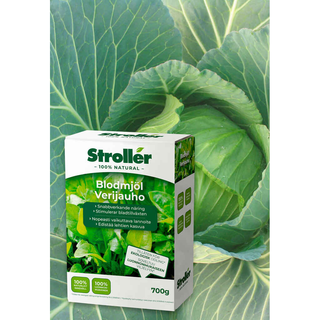 Stroller Verijauho sisältää runsaasti nopeasti vaikuttavaa, orgaanista typpeä. Stroller Verijauho edistää erityisesti kasvin lehtien kasvua ja sopiikin mainiosti voimakkaan kasvun vaiheessa oleville nuorille kasveille sekä vihanneksille, jotka vaativat paljon typpeä, kuten purjolle ja kaalikasveille. Nopeasti vaikuttava typpi vilkastuttaa myös maaperän mikrobien toimintaa ja edesauttaa kasvijätteen hajoamista takaisin kasville käyttökelpoisiksi ravinteiksi.