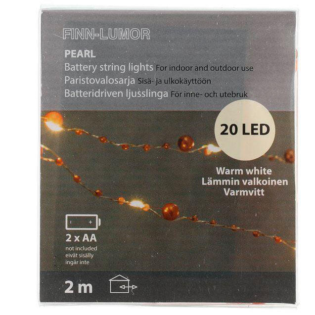 Paristovalosarja helmi 200 cm. Toimii kahdella AA-paristolla, jotka eivät sisälly pakkaukseen, 1,5V. Eri vaihtoehtoja: