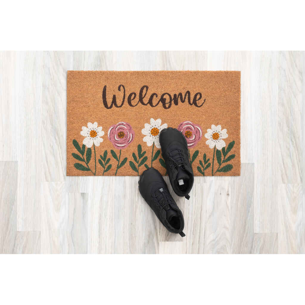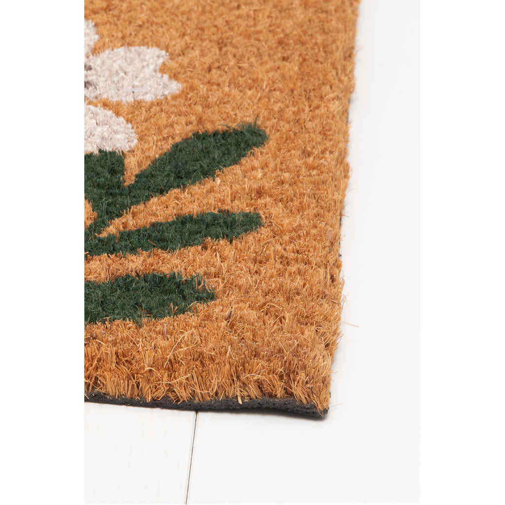 Kookoskuituinen ovimatto eli kynnysmatto kukkakuviolla. Ovimatto kerää tehokkaasti kenkien pohjissa kulkeutuvan lian ja pölyn. Koko 45 x 75 cm. Paksuus 16 mm. Materiaali kookoskuitu, vinyyli. Ravista, lakaise tai imuroi.