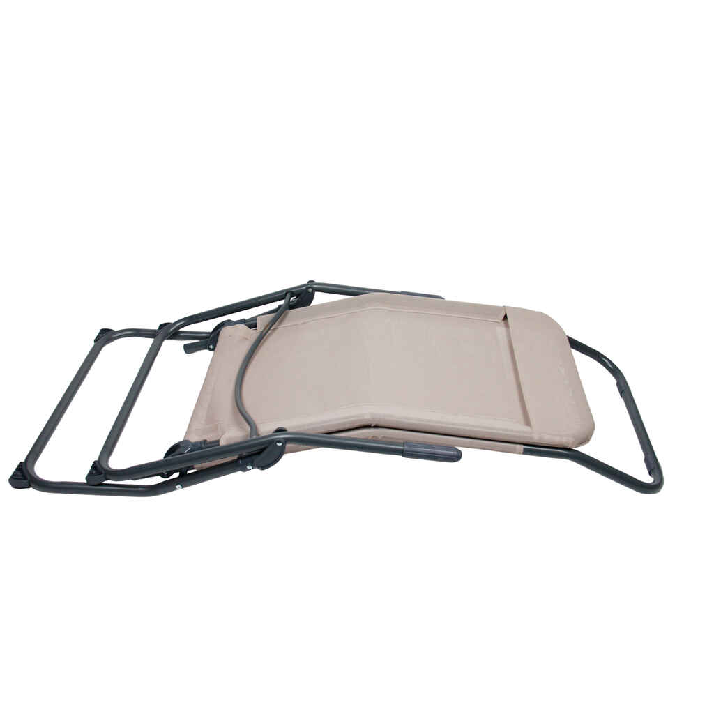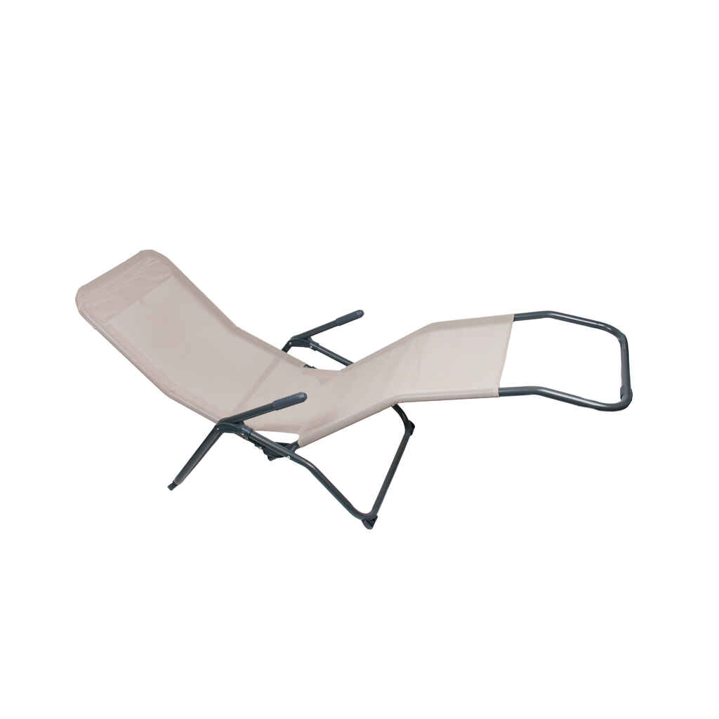 Aurinkotuoli beigellä kankaalla. Koko 140x60 cm, korkeus 96 cm. Painoraja 110 kg.