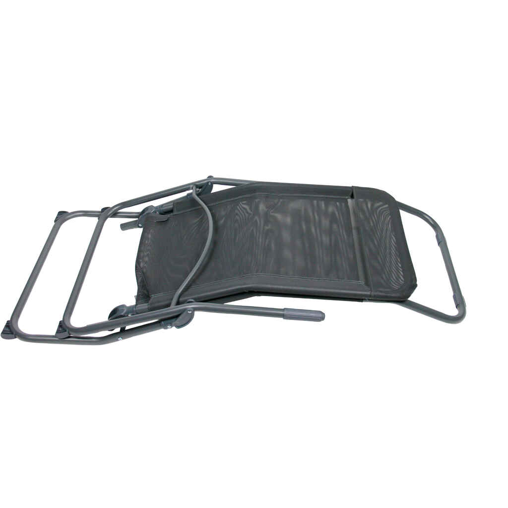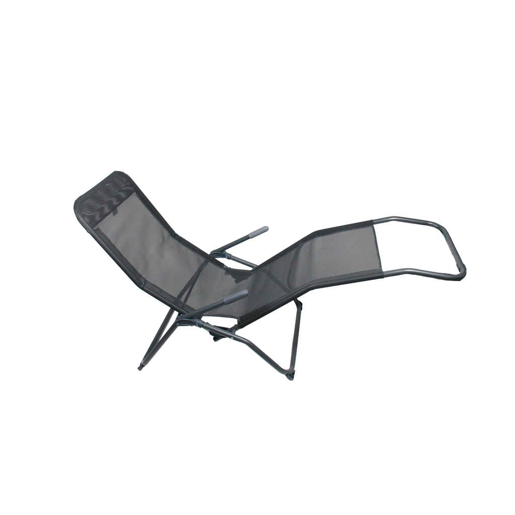 Aurinkotuoli tummanharmaalla kankaalla. Koko 140x60 cm, korkeus 96 cm. Painoraja 110 kg.