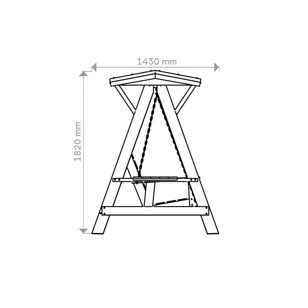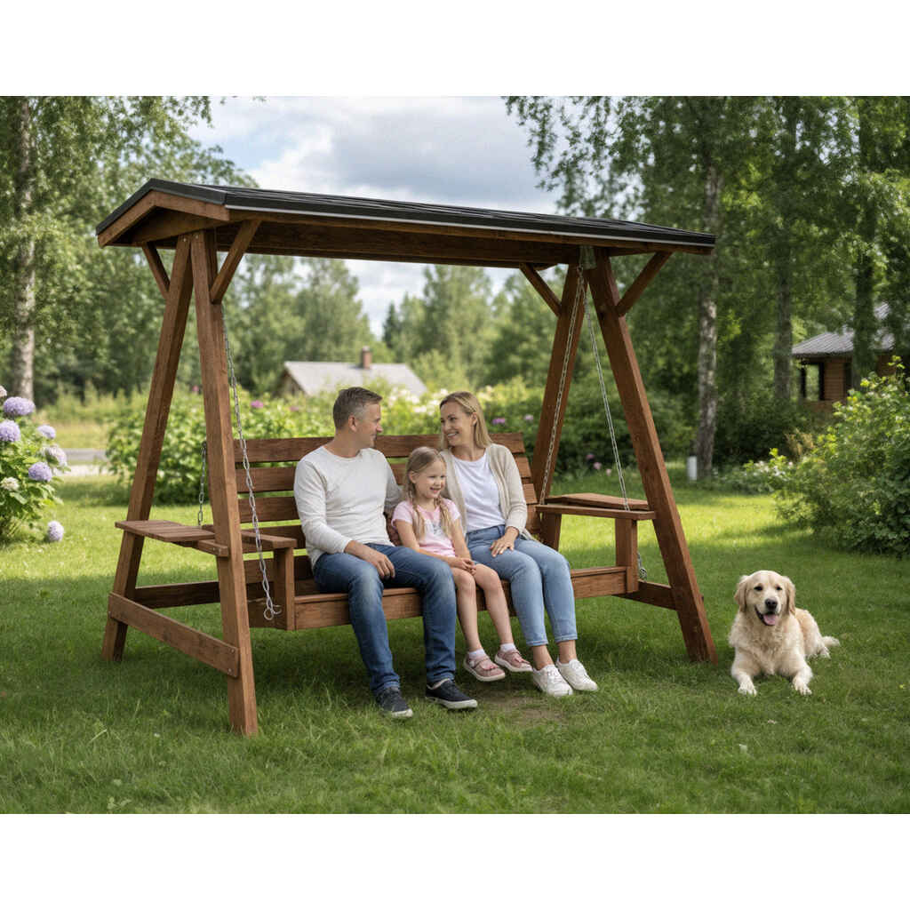 Kolmen istuttava pihakeinu kovalla katoksella. Suomalainen Avainlipputuote. Kaikki kiinnitykset ruuvein ja pultein. Reisilankut jämäkkää 40 mm havupuuta. Sävytetty vesiohenteisella kuullotteella. Sisältää bitumikatteen ja tippalistat.