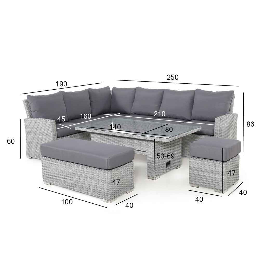 Tyylikäs ja monipuolinen ASCOT-puutarhakalustesetti sisältää korkeussäädettävän pöydän, kaksiosaisen kulmasohvan ja kaksi rahia pehmeillä pehmusteilla. Kaikkien osien rungot on valmistettu alumiinista ja päällystetty muovipunoksella.