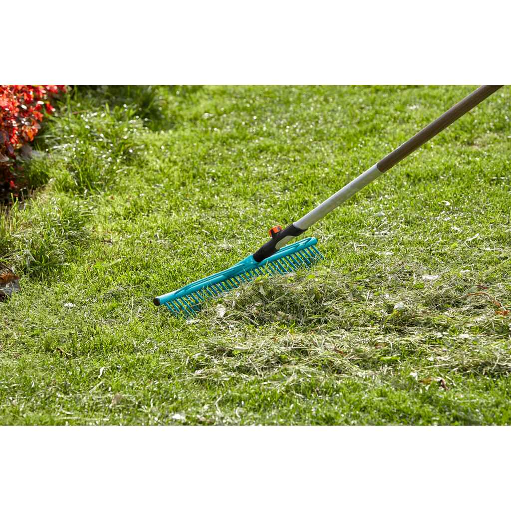 GARDENA Combisystem -nurmikkoharava on valmistettu korkealaatuisesta Duroplast-pinnoitetusta teräksestä, joka suojaa tuotetta ruostumiselta. GARDENA combisystem -nurmikkoharavalla leikkuujätteen ja lehtien haravointi käy kuin leikki. Kätevää: Leikkuujätteet ja lehdet jäävät haravoinnin aikana haravassa oleviin ruohonkeräyssankoihin. Työleveys on 60 cm. Nurmikkoharava sopii kaikkiin GARDENA combisystem -varsiin. GARDENA suosittelee 180 cm vartta. Takuu 25 vuotta.