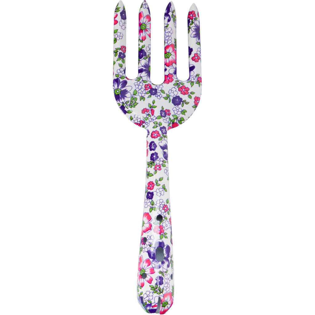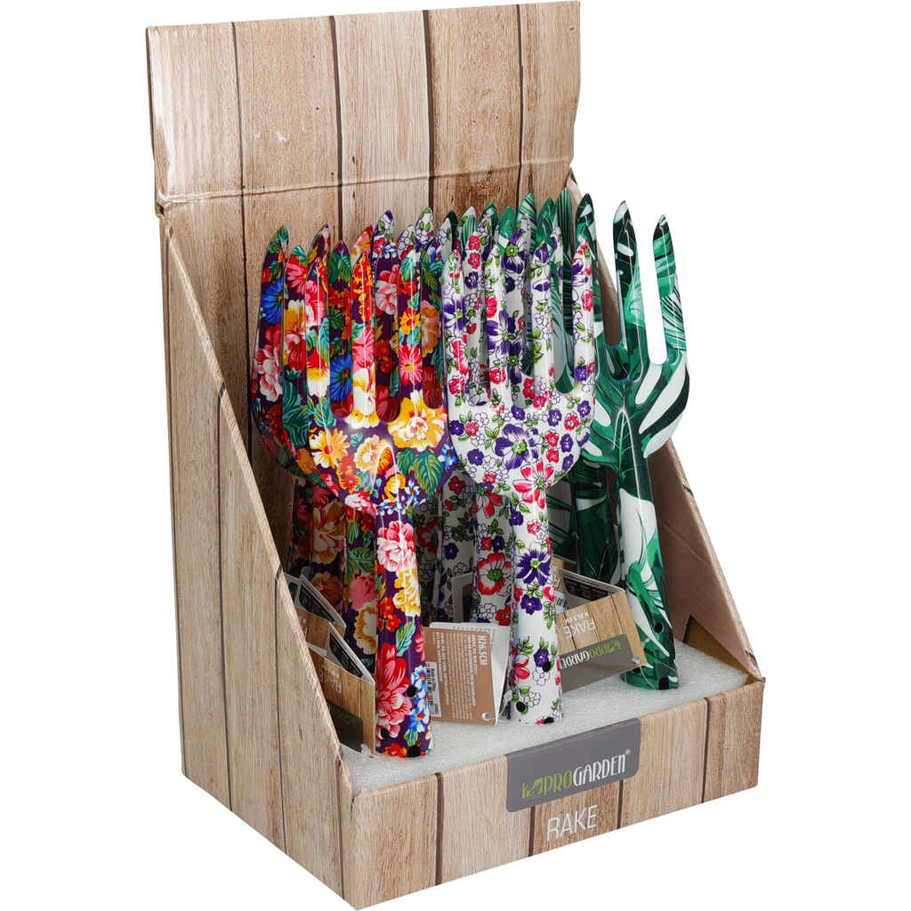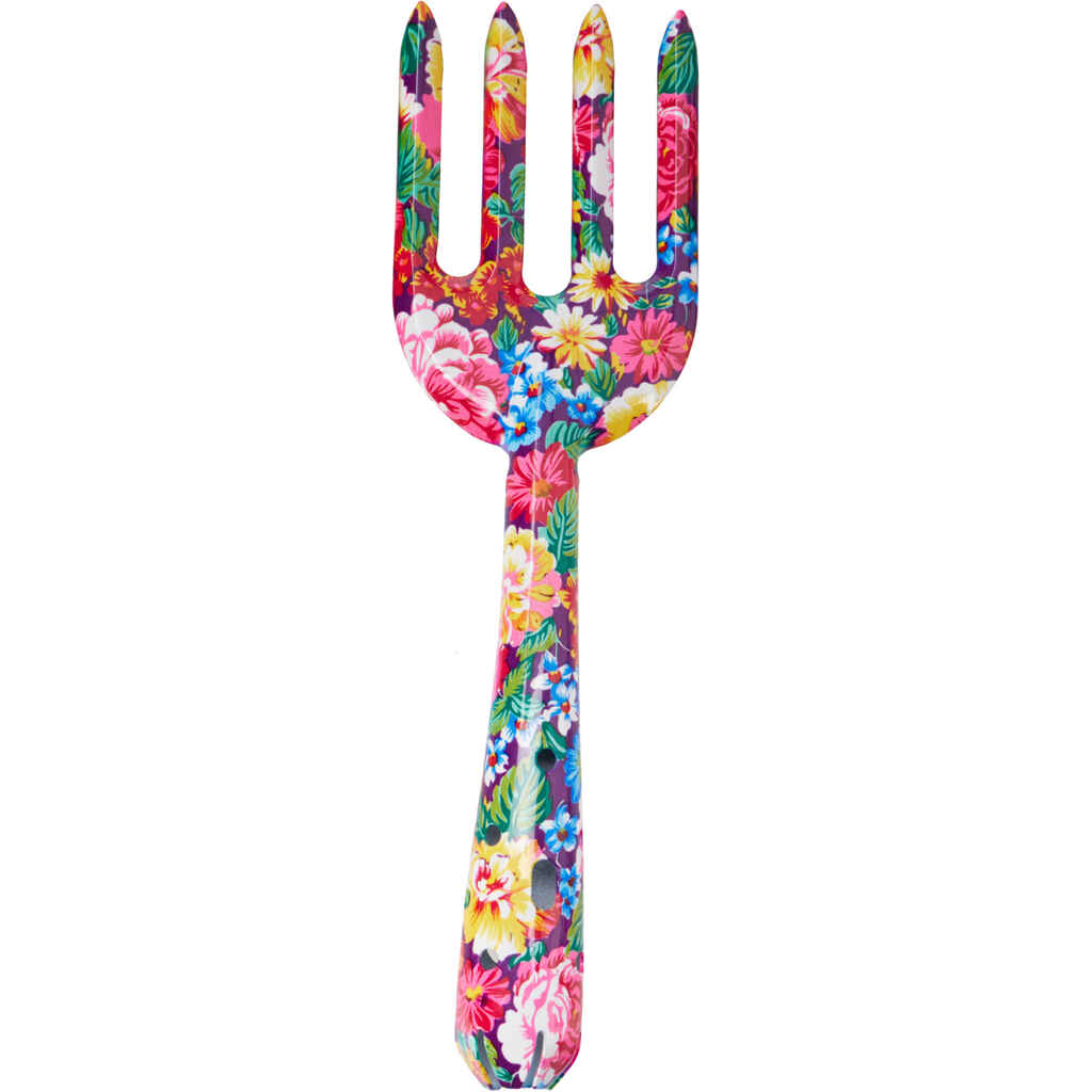 Kestävä rautainen puutarhaharava istutus- ja pihatöihin. Värikäs kukkakuosi tuo iloa puutarhanhoitoon.