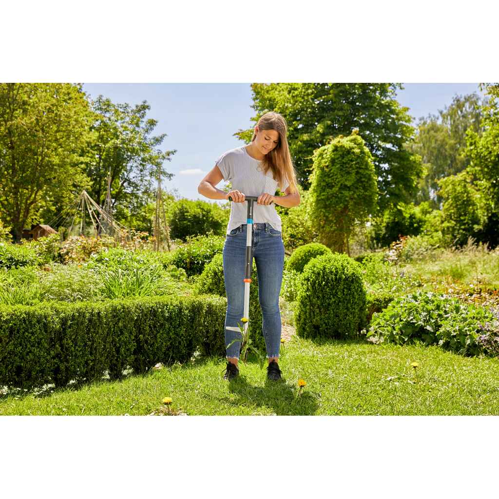 GARDENAn rikkaruohonpoistaja on erinomainen työkalu voikukkien poistamiseen nurmikosta ja kukkapenkeistä. Työläs voikukkien kitkeminen ei ole suosituimpia puutarha-askareita, mutta hyvät työvälineet tekevät työstä mielekkäämpää. Voikukan kitkijä auttaa poistamaan rikkakasvit helposti ja tehokkaasti ympäristöä säästäen. Sen patentoidut erittäin kapeat terät sijaitsevat lähellä toisiaan. Työskentely on näin tarkkaa ja nurmikkoa säästävää, sillä rikkakasvin poistosta jää maahan vain pieni reikä. GARDENA-rikkaruohonpoistaja on miellyttävä käyttää ja hellävarainen selälle pidemmänkin työskentelyn aikana. Ensisijaisesti voikukkien poistamiseen tarkoitettu työväline on varustettu käytännöllisellä metallisella jalkatuella, jonka avulla terät on helppo painaa maahan. Ergonomisesti muotoiltu kahva varmistaa miellyttävän liikkeen, kun kitkijää kierretään. Varren vapautusmekanismi tekee rikkakasvin pudottamisesta helppoa. Kitkeminen tapahtuu mekaanisesti ja ilman kemikaaleja, mikä suojelee luontoa. Rikkaruohonpoistajan avulla pidät puutarhan huoliteltuna sekä vapaana voikukista ja muista rikkakasveista. GARDENAn tuotteelle myöntämä 25 vuoden takuu on osoitus korkeasta laadusta.