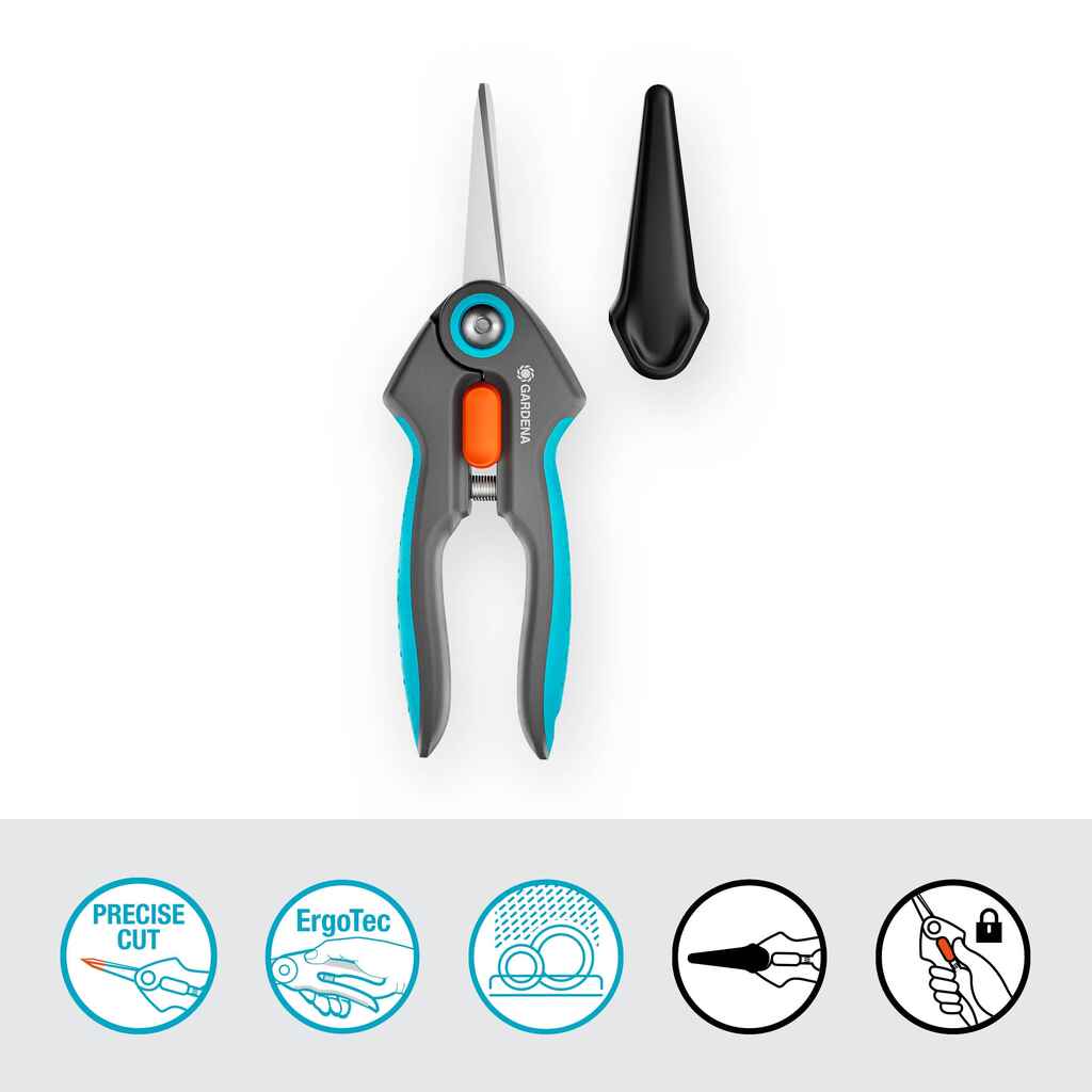 GARDENA FreshCut -yrttisakset tekevat erityisesti tuoreiden yrttien, marjojen tai leikkokukkien keräämisestä helppoa. Ruostumattomasta teräksestä valmistetut kapeat tarkkuusterät tekevät vaikutuksen. Pitkät, terävät leikkuureunat takaavat siistin ja tarkan leikkausjäljen aina kärkeen asti, myös ahtaissa paikoissa. Hentojen yrttien, kuten basilikan, leikkaaminen käy helposti. Pehmeäpintaisten ErgoTec-kahvojen ansiosta sakset istuvat mukavasti ja tukevasti käteen. Mukana tulevaa suojaa käytetään terien turvallista säilytystä varten, ja yhden käden lukitusmekanismi avaa ja lukitsee sakset kätevästi. FreshCut-yrttisakset ovat elintarviketurvalliset, mikä tarkoittaa, että niistä ei siirry hajuja tai makuja. Helppoa puhdistusta varten sakset voi laittaa astianpesukoneeseen. GARDENA tarjoaa 25 vuoden valmistajan takuun tälle Saksassa suunnitellulle laatutuotteelle online-rekisteröinnin myötä osoitteessa www.gardena.com/registration.