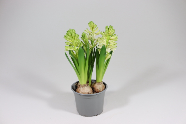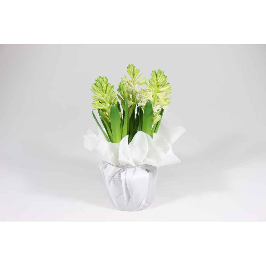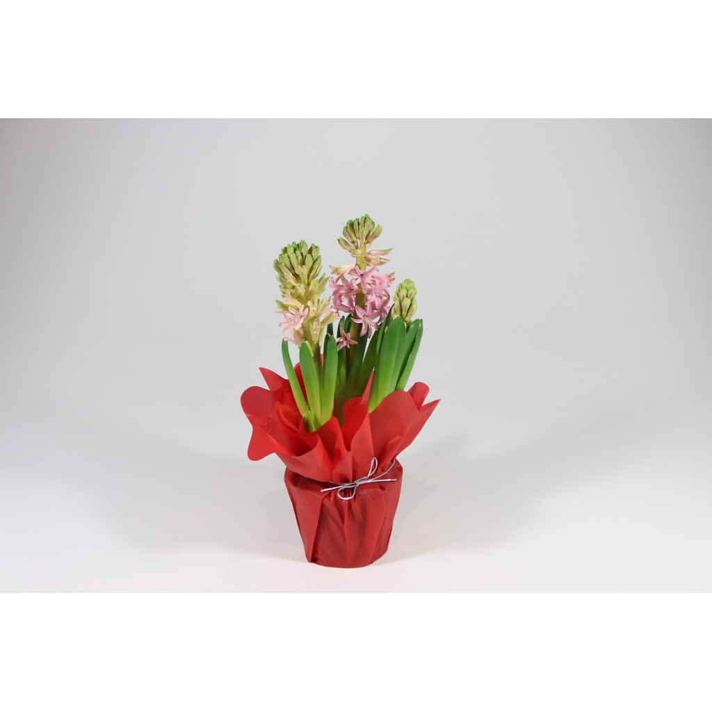 Valikoima eri värisiä hyasintteja lahjakääreessä. Monelle hyasintin tuoksu on tärkeä osa joulutunnelmaa. Hyasinttia kastellaan niukasti.