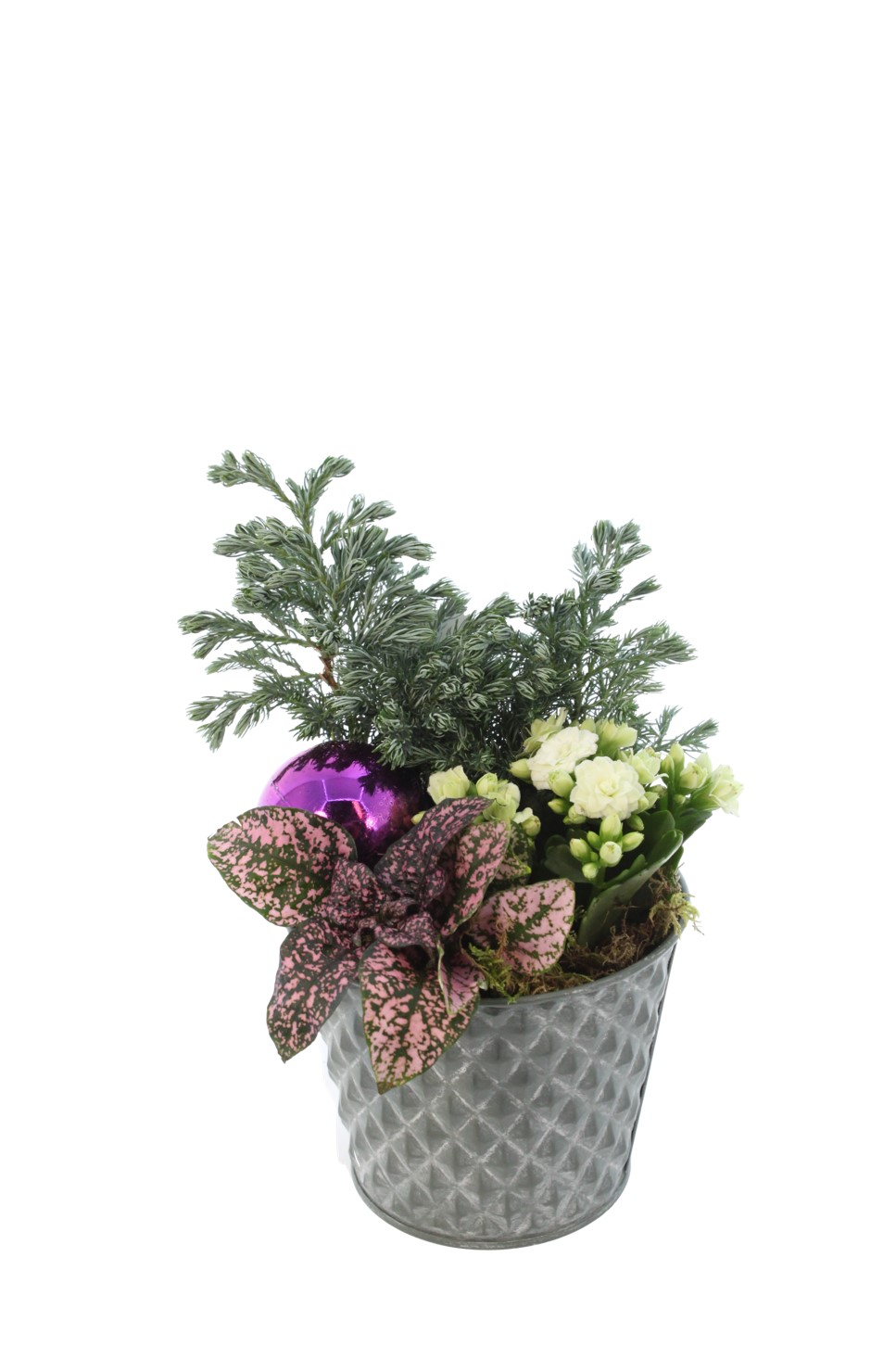 Sinkkiruukussa matala havu, valkoinen tulilatva, pitsilehti sekä koriste.