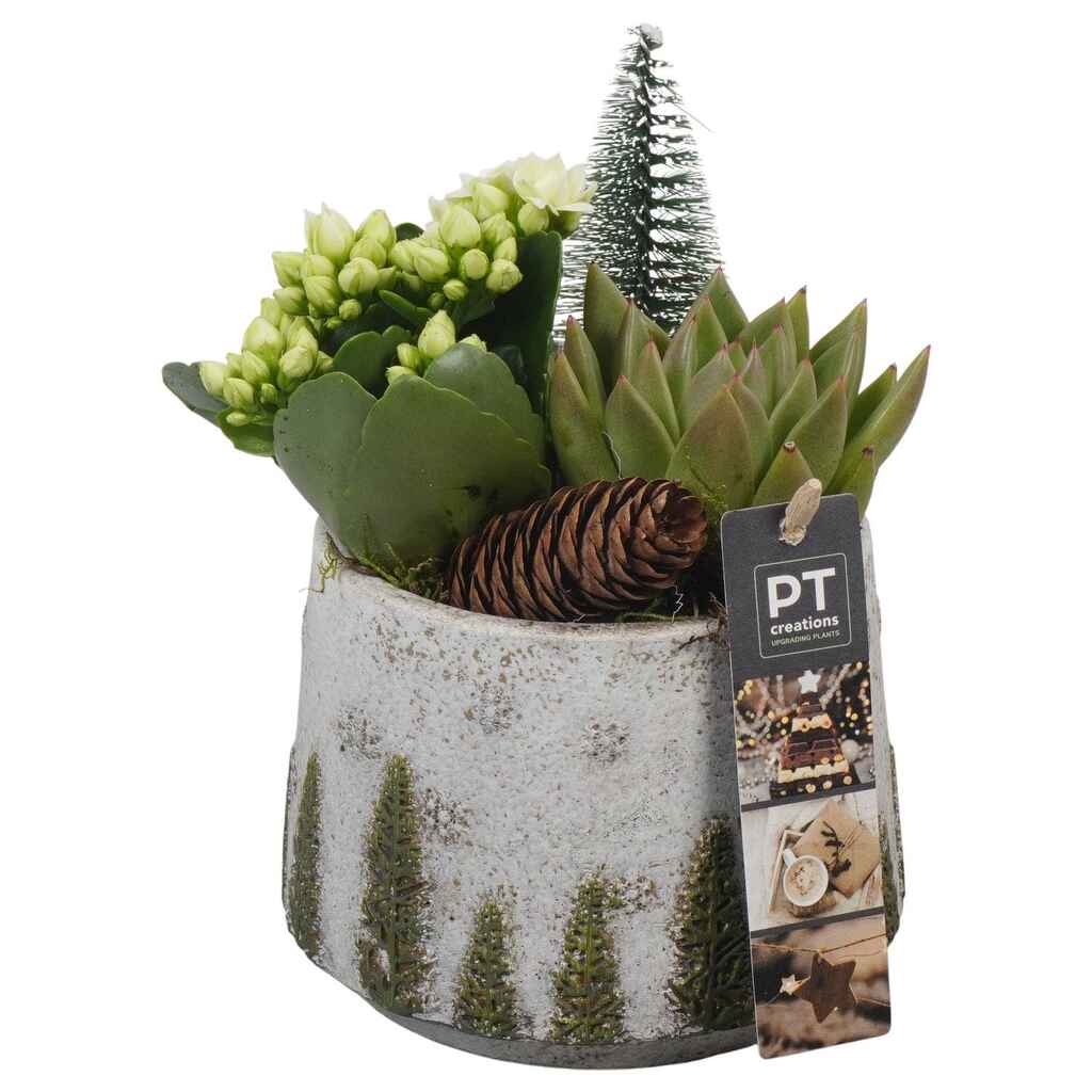 Keraamisessa kuusiruukussa mehikasvi sekä tulilatva sekä koristeet. Korkeus 20 cm. Ruukun halkaisija 13 cm.