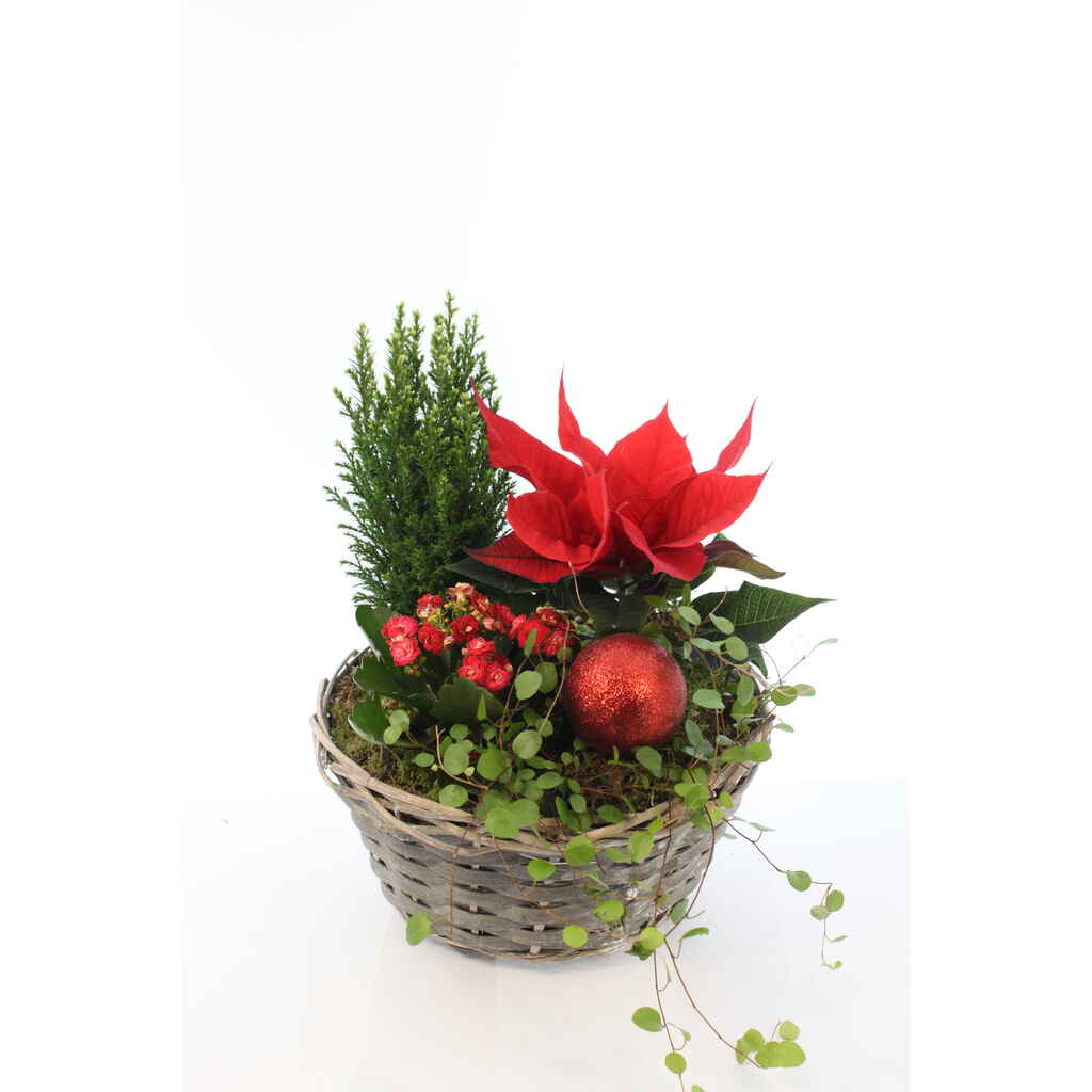 Joulutähti -istutuksessa lisäksi havu, tulilatva sekä lankaköynnös ja koriste.