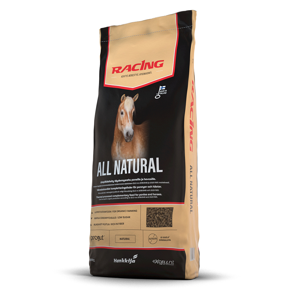 Runsaasti puhdasta luomukauraa, luomuruohojauhoa ja luomurapsia sisältävä Racing All Natural -täysrehu hevosesi kokonaisvaltaiseen hyvinvointiin. Voidaan käyttää luonnonmukaisessa tuotannossa asetuksen (EU) n:o 2018/848 ja 2021/1165 mukaisesti.