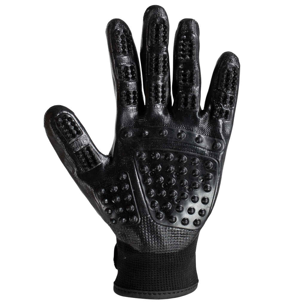 Näppärät hoitokäsineet hevosen hoitoon ja hierontaan. Hoitokäsineiden kuminäppylät helpottavat hevosen hankaamista esimerkiksi hevosta pestessä. Kätevät myös karvanlähtöaikaan. Käsineet soveltuvat käytettäväksi kuivana tai märkänä. Säädä sopivaan kokoon ranteessa olevan säätöhihnan avulla.