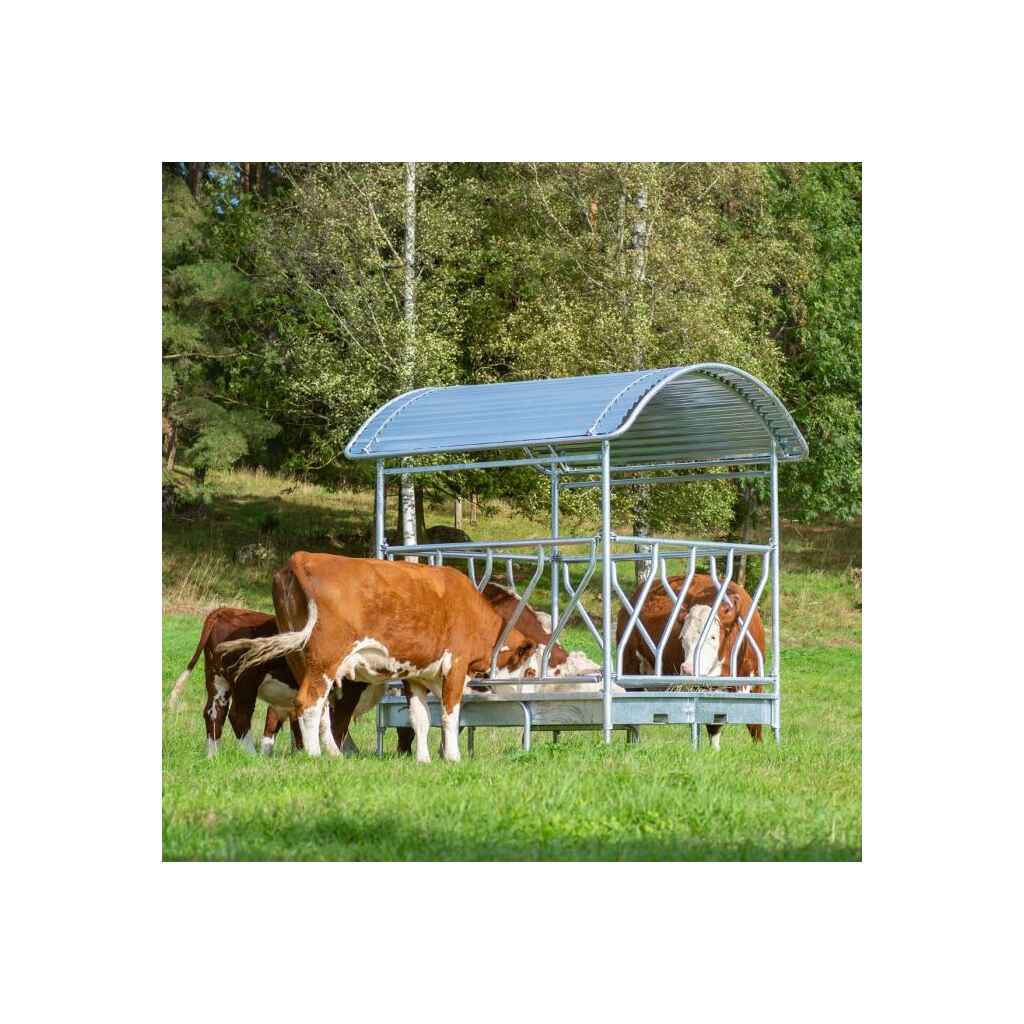 "Diagonaalikaltereilla" varustettu sinkitystä materiaalista valmistettu ruokintakatos naudoille. Avatavat sivut. Toimittetaan osina.