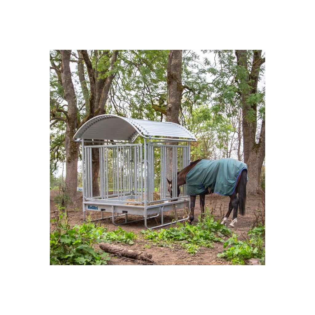 Kaltereilla varustettu sinkitysta materiaalista valmistettu ruokintakatos hevosille. Yhteensä 12 ruokitnapaikkaa. Kalterin tihellä osuudella putkien väli 50mm, ruokinta-aukon kohdalla 325mm. Katon korkeus säädettävä. Aukeavat sivut. Soveltuu myös suuremmille pyöröpaaleille.Toimitetaan osina.
