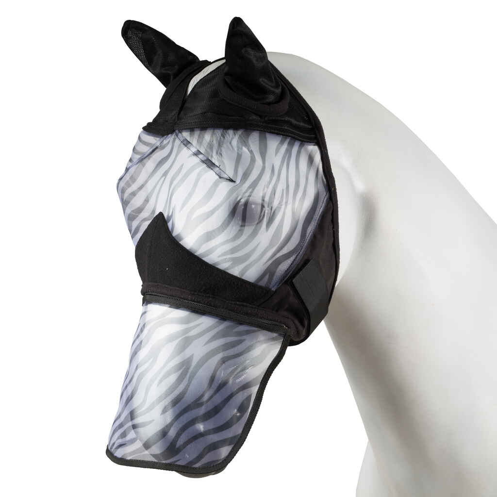 Klassinen seepraraidoitettu kärpäshuppu, joka suojaa hyvin hevosen turpaa, korvia ja silmien aluetta. UV-suojattu kangas antaa suojaa myös auringolta ja hupun seepraraidat hämäävät hyönteisiä pitäen ne loitolla. Hyvin hengittävää verkkokangasta korvien alueella ja hankausta ehkäisevät fleecereunukset. Näppärä tarrakiinnitys ja irrotettava turpaosa. Materiaali: 100% polyesteri
