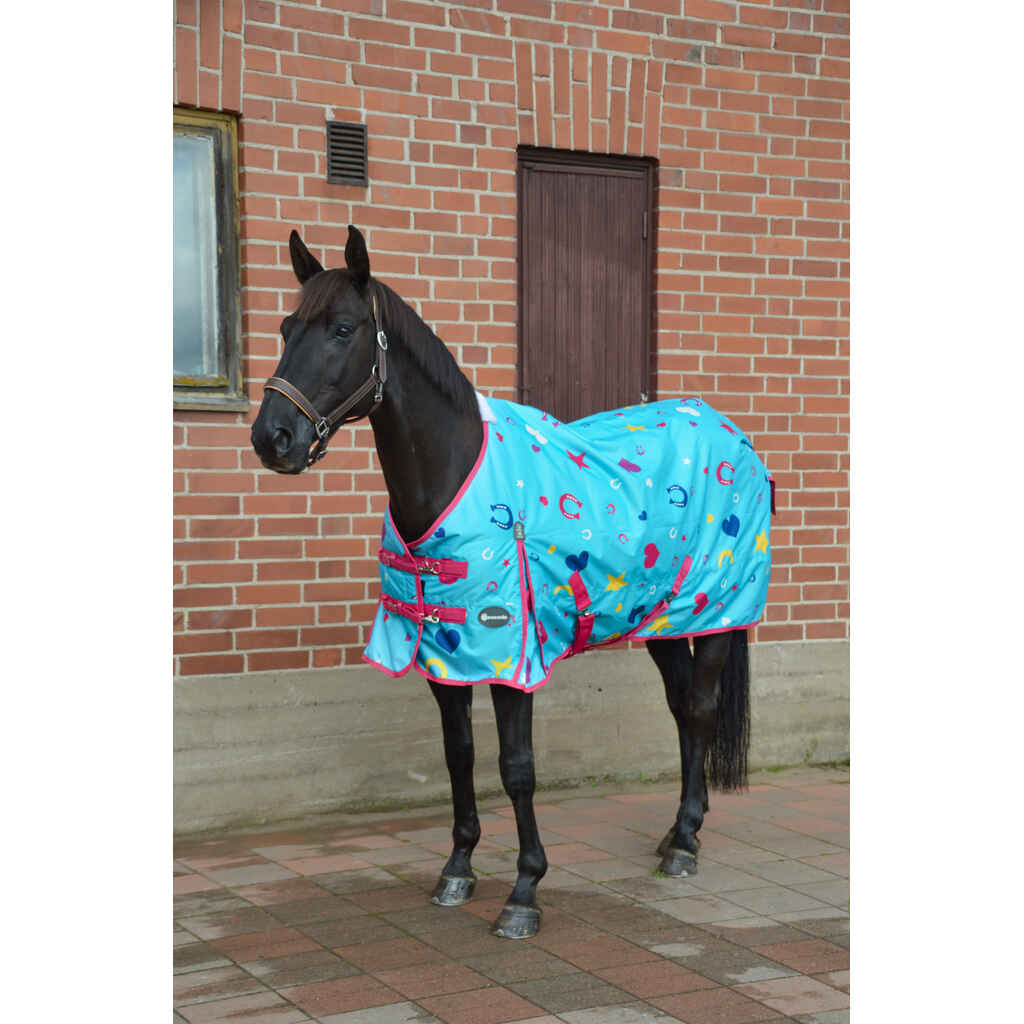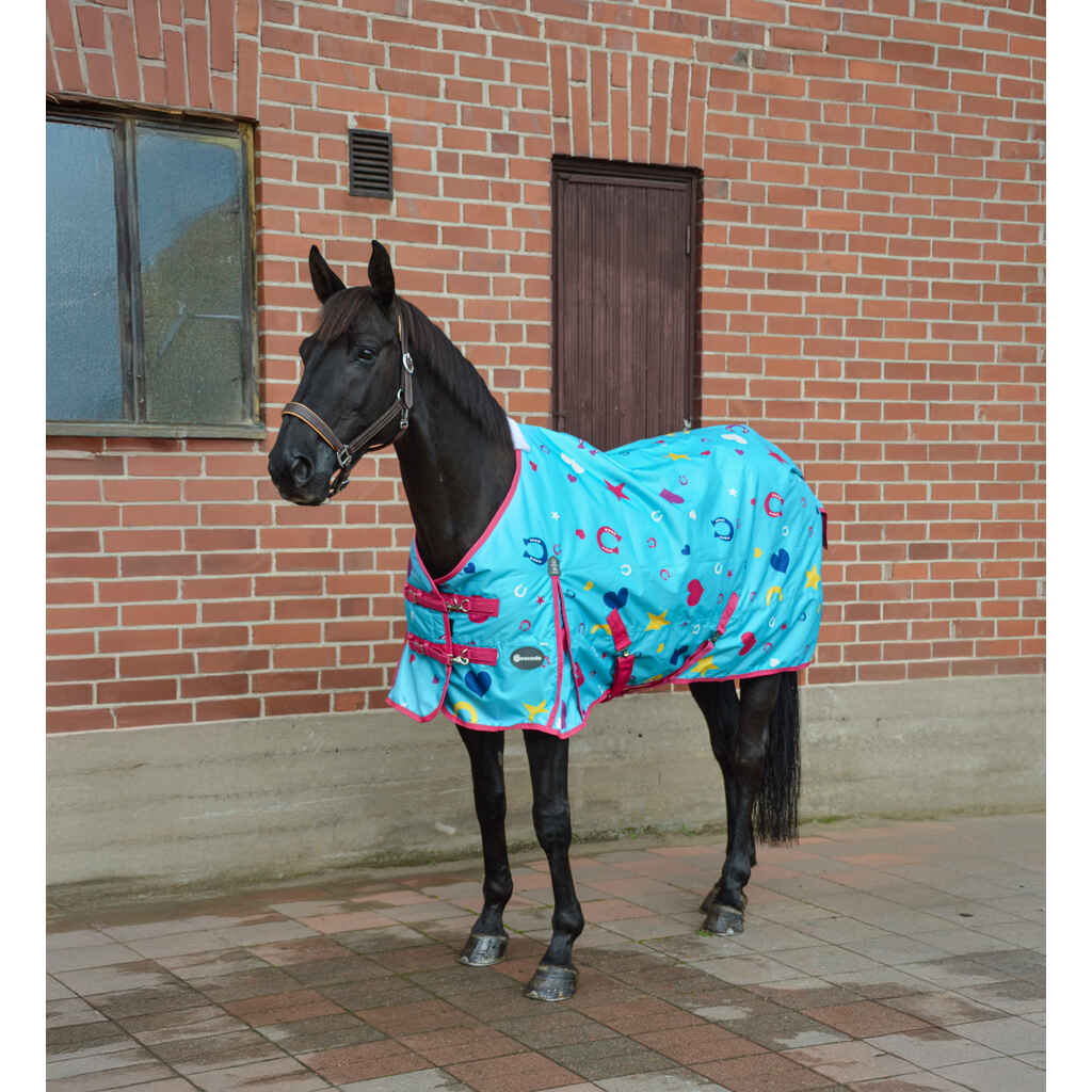 EQCode Rufus Sadeloimi ponille syksyn 2025 pirteässä kuosissa! Kuvioitu turkoosi päällikangas on vahvaa 600D Ripstop polyesteria. Loimessa on normaali kaula-aukko sekä moneen säähän sopiva 100g paksuinen toppaus. Edessä säädettävä pikalukkokiinnitys kahdella soljella ja takana häntäläpän lisäksi myös häntänaru ja jalkalenkit. Vedenpitävä (5000) ja hengittävä (5000). Saatavilla koot: 85-135 cm.
