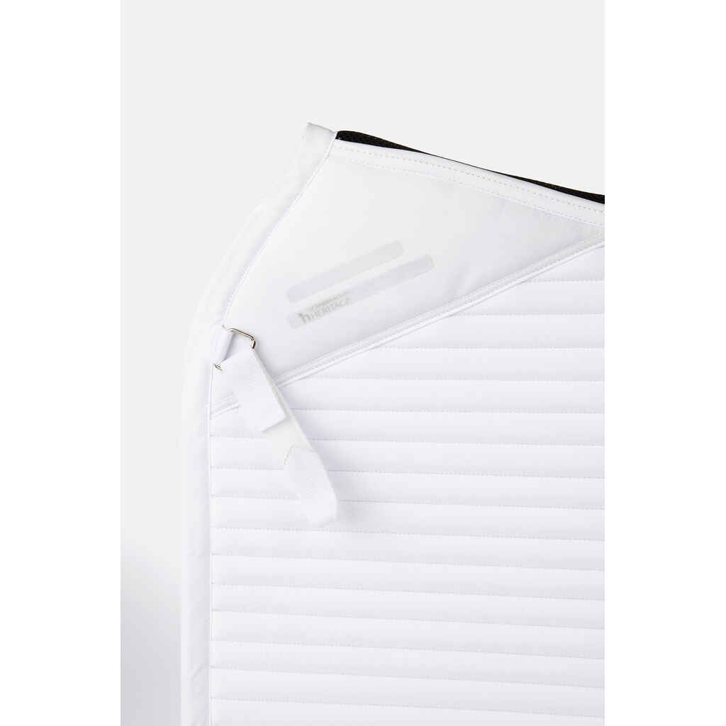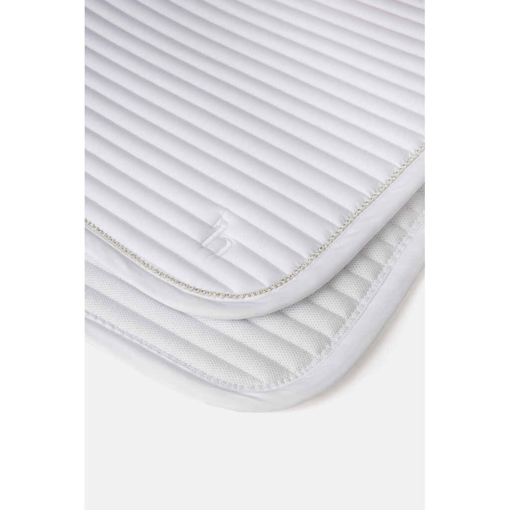 Horze Symphony koulusatulahuovassa on elegantin tyylikäs suoralinjainen tikkaus ja siroin kivin koristeltu reunanauha huovan takaosassa. Satulahuovassa on kaksi kiinnitysvaihtoehtoa (irrotettava nauha D-renkaalla sekä lenkki vastinhihnoille). Silikonipainatus sään kohdalla pitää satulan paikoillaan. Horze Symphony koulusatulahuovassa saatavilla myös valkoinen vaihtoehto kisahuovaksi!