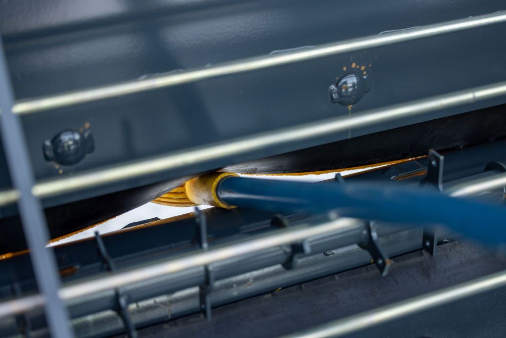 Hiekoitustelan harjalista puhdistaa ja tukee hiekoituskumia pitäen sen tiiviinä. Tämän ansiosta kitaa on voitu avartaa, jolloin suuret yksittäiset kivet pääsevät läpi eivätkä jumita telaa.