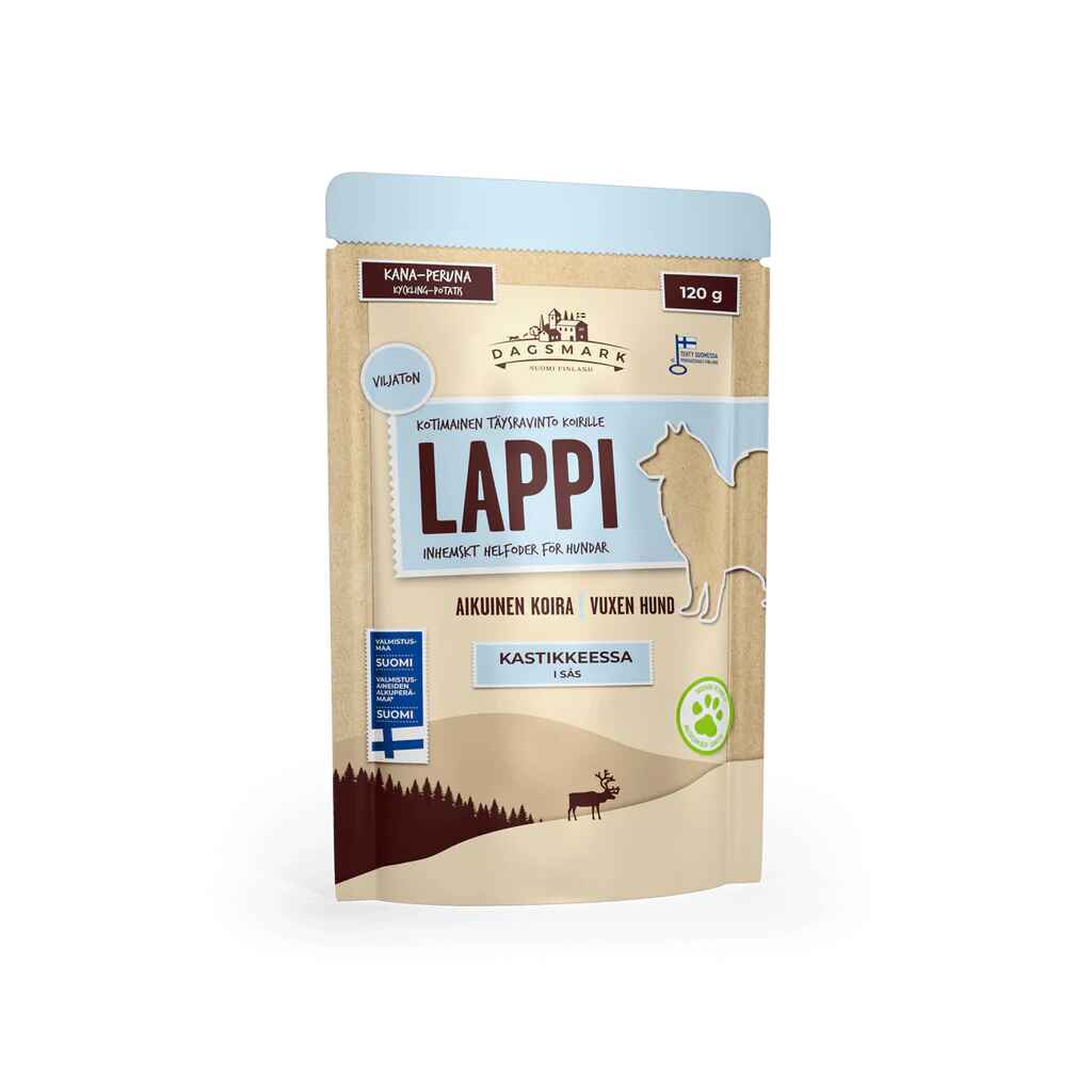 Dagsmark LAPPI -märkäruoka sisältää kotimaista tuoretta kanaa ja perunaa kastikkeessa. Ruoassa on maukas ja proteiinipitoinen koostumus. Lihapaloista kanaa on 80 %. Ei sisällä soijaa, lisättyä sokeria, säilöntä- tai väriaineita. Tuotteessa käytetty peruna on elintarvikelaatuista. Täysravinto.