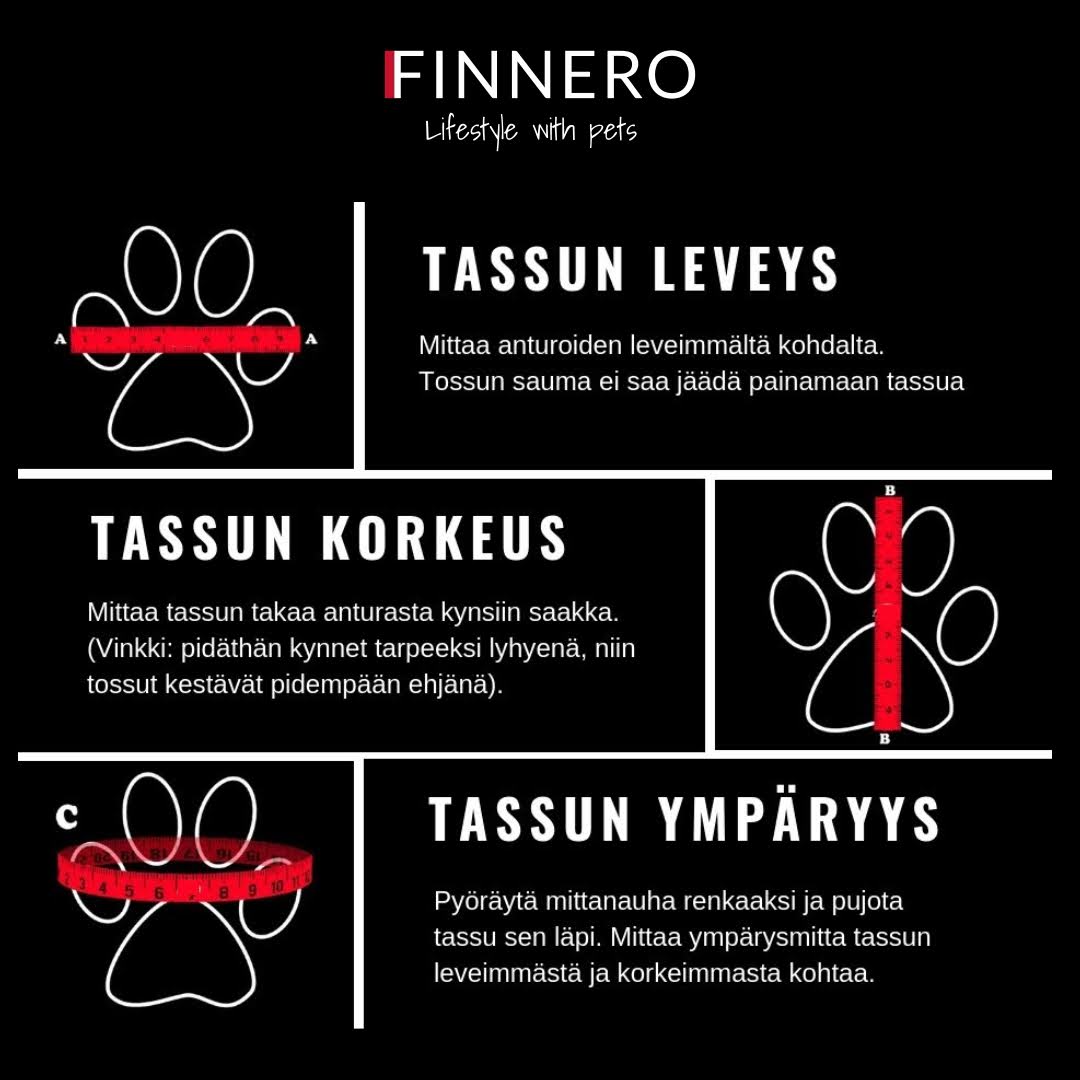 Kevyet ja pehmeät Finnero Halla softshell-tossut pitävät koiran tassuista huolta kaikissa sääolosuhteissa! Pehmeä ja joustava softshell-kangas hylkii vettä ja suojaa näin koiran tassuja kosteudelta, loskalta ja kuralta. Tossuissa on myös käytännöllisiä heijastavia yksityiskohtia. Softshell-tossuissa oleva etuhalkio helpottaa pukemista ja näppärä tarrakiinnitys pitää tossut paikoillaan kovemmassakin vauhdissa. Tossujen pohjassa on vettähylkivä ja pakkasenkestävä liukuestemateriaali.