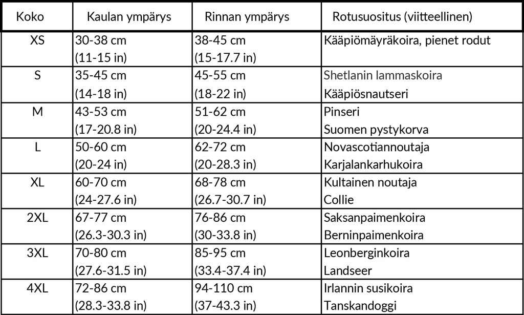 | Koko | Kaulan ympärys | Rinnan ympärys | Rotusuositus |
