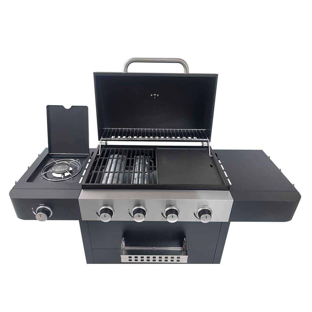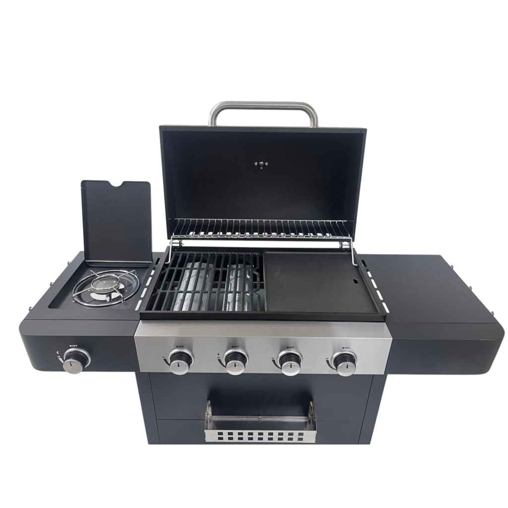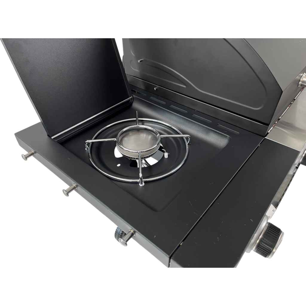 Roaster grillissä on kompakti grillausala ja kolme poltinta ja sivukeitin. Tehot: 2,1 kW/poltin, sivukeitin 2,5 kW. Grillin kupu, etupaneeli ja sivutasot ovatkestävää pulverimaalattua terästä. Grillin kompakti paistopinta-ala muodostuu valurauta-parilasta ja ritilästä. Sivukeittimen ansiosta valmistat keitokset samalla kun grillaat.