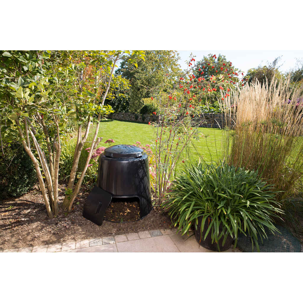 Puutarhajätteiden kompostointiin musta Rapid kompostori 280 l sisältäen pohjan. Soveltuu 2-4 henkisen perheen käyttöön. Valmistettu 100 % kierrätetystä materiaalista (PP). Suuri saranoitu syöttöaukko ja liukutyhjennysluukku helpottavat täyttöä ja tyhjennystä. Sileät sisä- ja ulkopinnat helpottavat puhdistamista. Kompostorin kannen sivuilla on tuuletusaukot, jotka lisäävät kompostorissa ilmankiertoa ja nopeuttavat kompostoitumista.