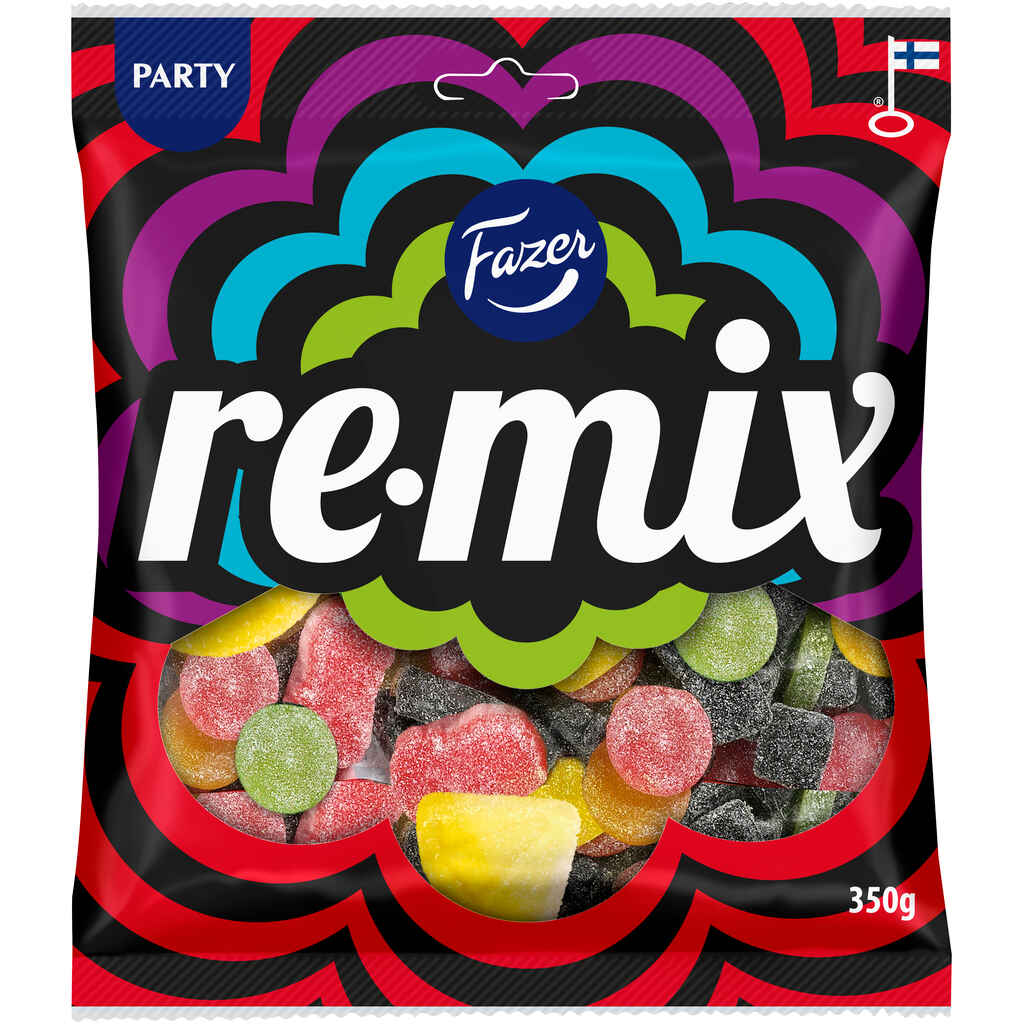 Remix on markkinoiden monipuolisin karkkipussi ja karkkihyllyn värikäs kingi. Oletko suklaanystävä tai salmiakkihiiri, vai himoatko kirpeitä karkkeja? Pussi on runsas sekoitus salmiakin, hedelmän ja kirpeän karkin makuja. Mukana myös Remix-perheen suosituin karkki, kirpeä hedelmägreippi. Remix karkkipussi on juhlien itseoikeutettu keskipiste, josta riittää jaettavaksi isommallekin porukalle.
