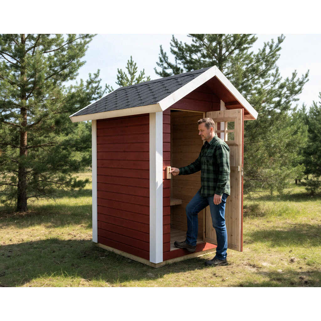 Ennen käyttöönottoa puuceehen on asennettava ulkokäyttöön sopiva kate, joka ei sisälly toimitukseen. Katteen tarve noin 4 m2. Lisäksi ennen käyttöönottoa tuote on käsiteltävä ulkokäyttöön soveltuvalla suoja-aineella. Huolehdi, että käsittelet aineenvalmistajan suositusten mukaan. Uusintakäsittely myöhemmin uudelleen tarpeen mukaan. Huussin harjakorkeus 247 cm. Pohjan pinta-ala n. 1,6m2.