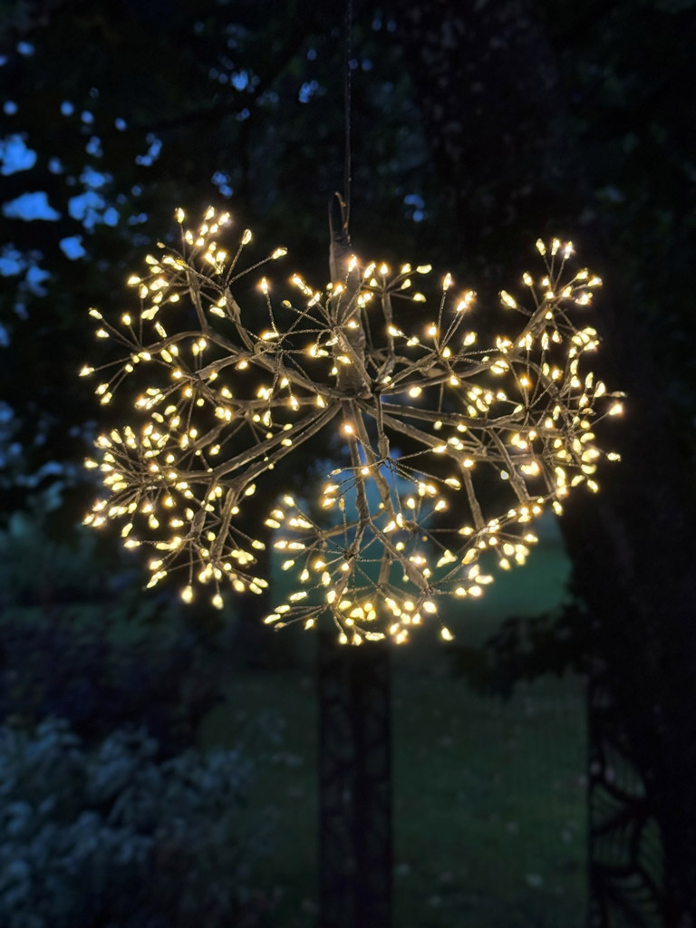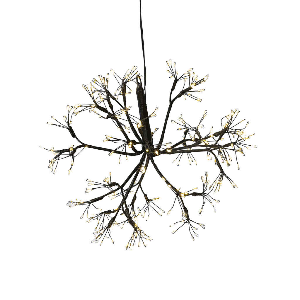 Upea valopallo säkenöi talviyössä kuin ilotulite! Soveltuu ulkokäyttöön, joten Hedda-valokoristeella voit luoda näyttävän valoefektin parvekkeelle tai terassille. Ø 30 cm pallo muodostuu 12:sta oksasta, joista jokaisen päässä on rypäs lämpimän valkoisia ledejä. Johto ja runko-osa ovat tummia, joten pimeässä illassa erottuu vain ledien tuike.