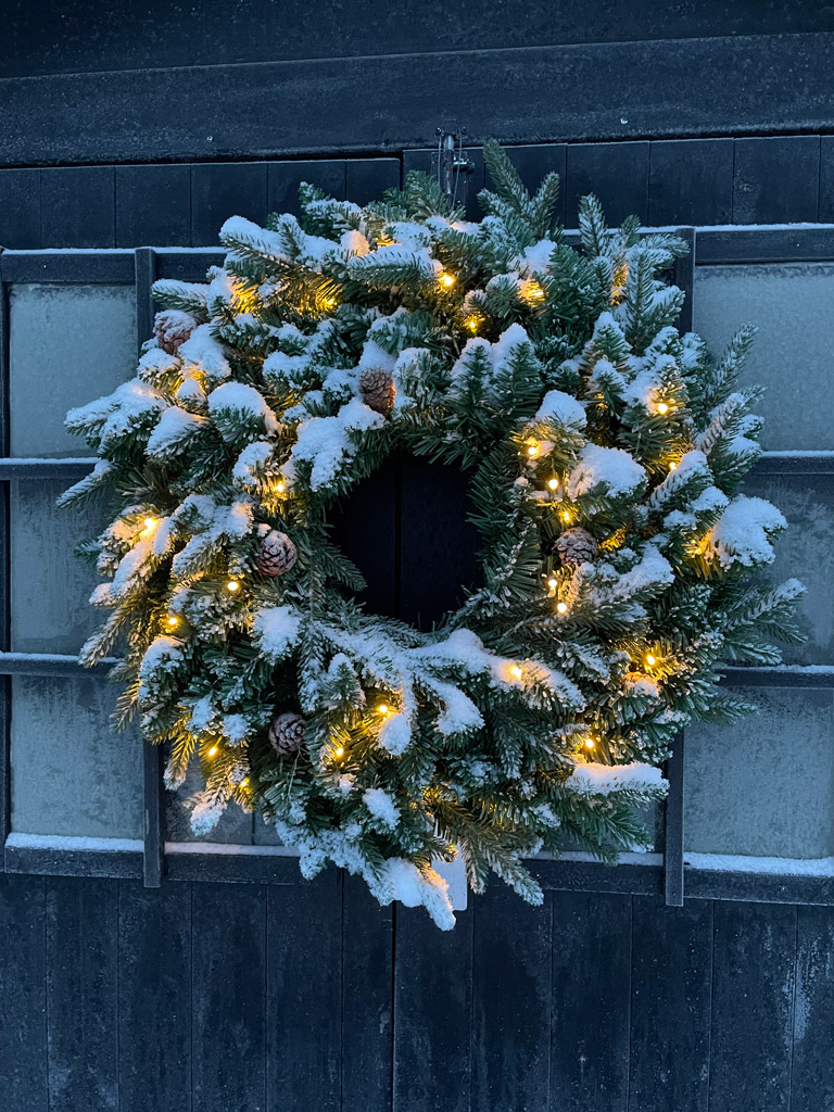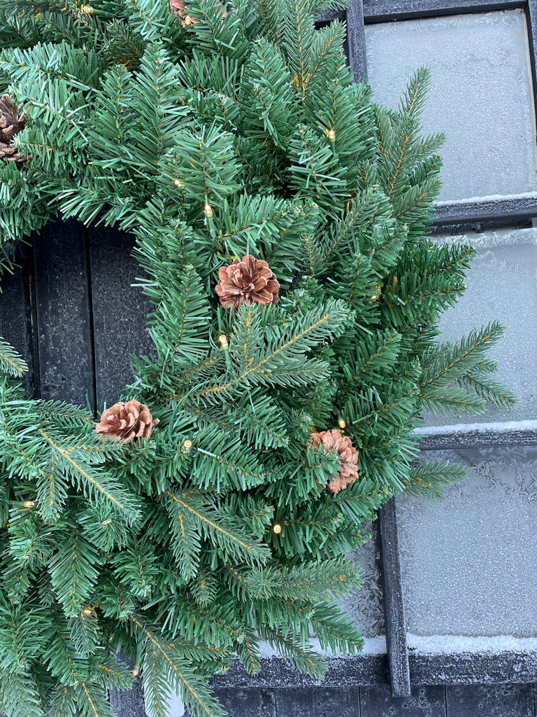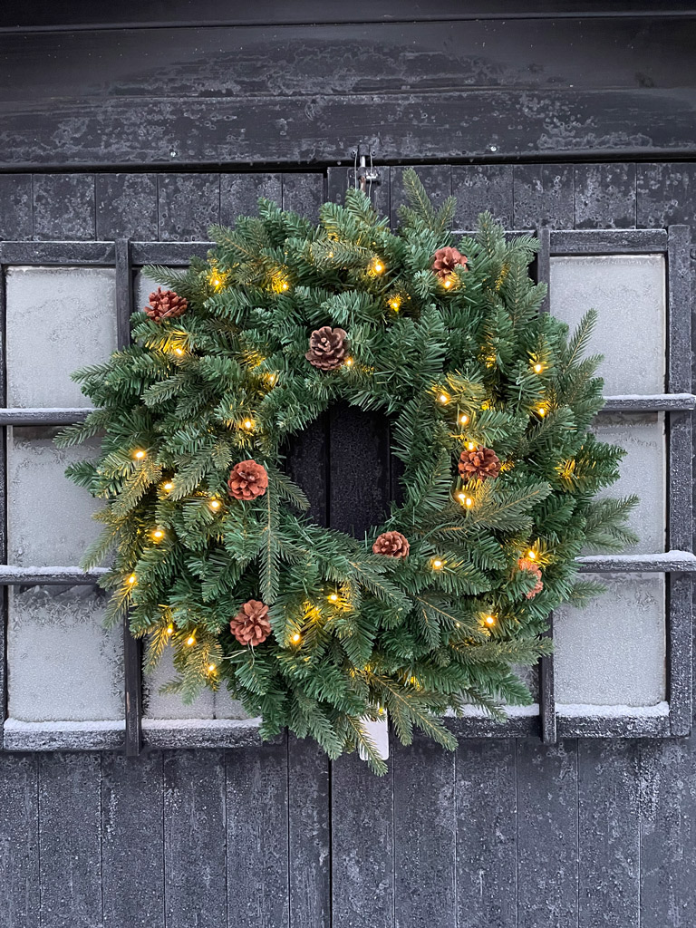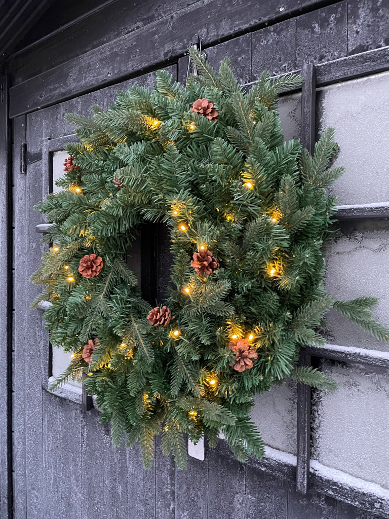 Vihreä havukranssi. Halkaisija 60 cm. Kranssissa 35 LED-valoa. Ajastintoiminto 6h on/18h off. Paristokotelon suojaus IP44, soveltuu ulkokäyttöön. Paristot 3 x AA (ei sisälly). Kävyt eivät sisälly.