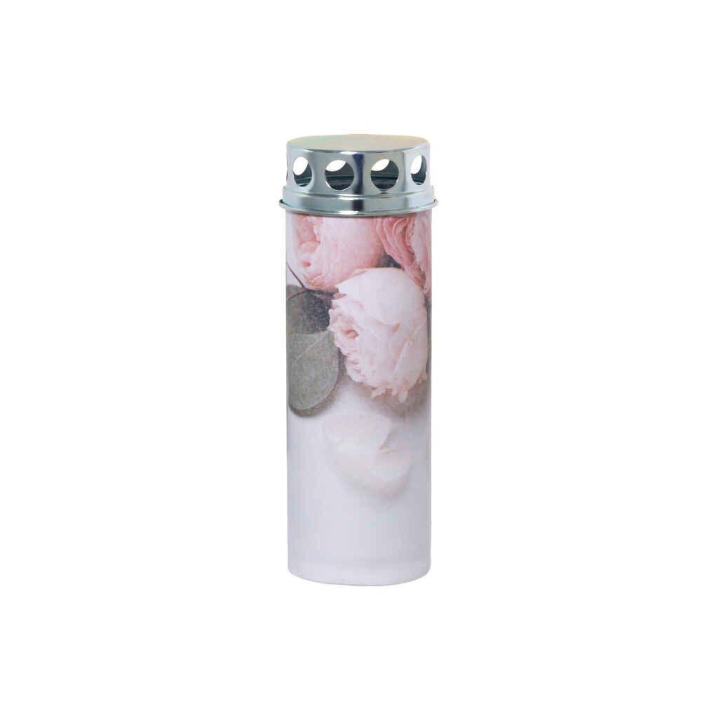 Hautakynttilä paperista valmistetussa astiassa. Ei sisällä lainkaan muovia! Paperi on käsitelty kestämään korkeita lämpötiloja. Täysin valmis kierrätettäväksi. Paperissa on kaunis kukkakuvio. Paloaika noin 24-28 h.