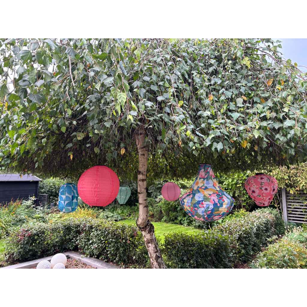 Pinkki kankainen solarvalo. Materiaali sopii myös ulos.