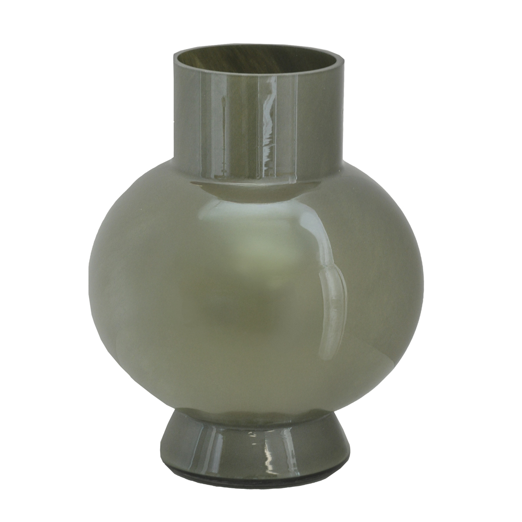 Oliivinvihreä kapeasuinen lasimaljakko. 18x18x22 cm.