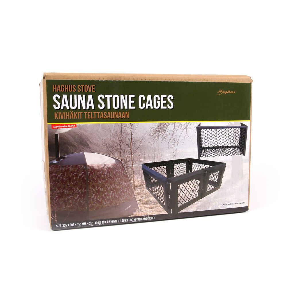 Kivihäkki Haghus telttakamiinaan kiuas käyttöä varten. Kivihäkkien avulla muutat kamiinasi kätevästi kiukaaksi telttasaunaa varten. Pakkauksessa kaksi häkkiä, yksi kamiinan sivulle ja toinen kokoon taittuva häkki päälle. Asenna vain häkit paikalleen ja lisää kivet. Materiaali vahvaa terästä.