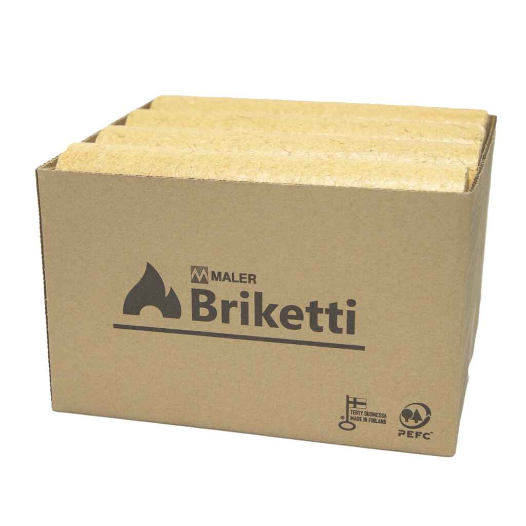Maler PuuBriketti, ympäristöystävällistä ja uusiutuvaa bioenergiaa! Laadukas havupuubriketti on valmistettu puhtaasta ja vastuullisesti kasvatetusta suomalaisesta puusta. Briketit valmistetaan tuotannon ylijäämämateriaalista ja sivutuotteista, sadanpurusta ja höylänlastuista puristaen ne tiiviiksi brikettitangoksi. Perinteiseen polttopuuhun verrattuna briketti palaa kauemmin, säästeliäämmin ja myös tasaisemmin kauniilla liekillä. Palaessaan briketti ei aiheuta räiskymistä. Briketin lämpöarvo on n. 5,35kWh/kg, joka on korkeampi kuin perinteisten polttopuiden. Yhdessä laatikossa on 9kg brikettiä, pakkauslaatikon voi hyödyntää sytykkeenä, näin ylimääräistä roskaa ei synny. Tuotteella on PEFC-sertifikaatti ja se on suomalainen Avainlipputuote. Säilytys kuivissa tiloissa.
