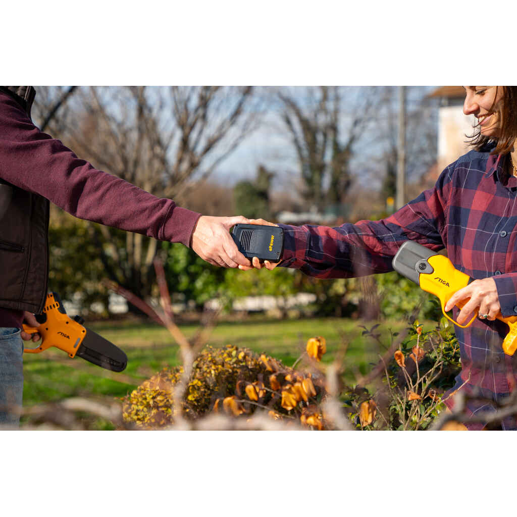 - 1 Akku ja laturi mukana - Molemmat työkalut ovat yhteensopivia STIGA 1 Series 20V -akun kanssa, joka on vaihdettavissa muiden sarjan työkalujen kanssa.