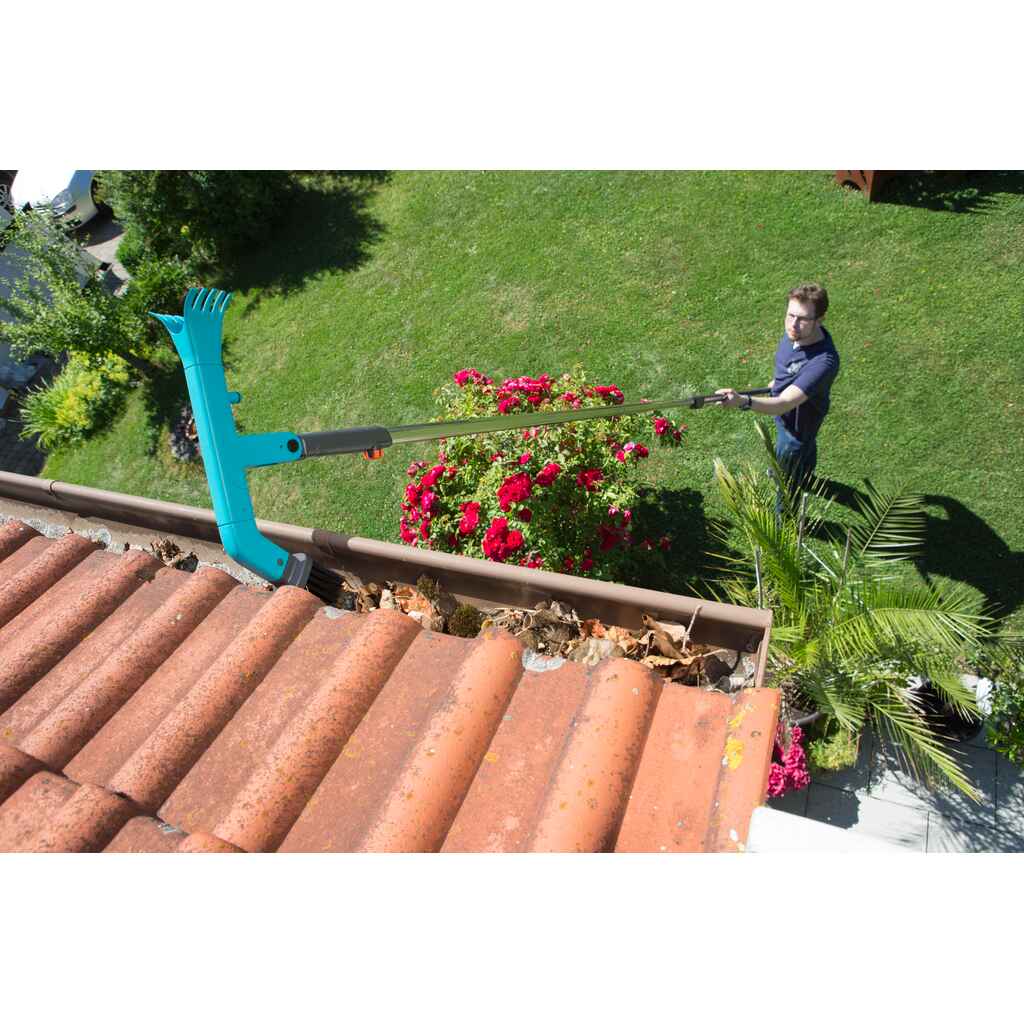 GARDENA combisystem -räystäskourun puhdistaja on ihanteellinen työväline, kun on aika puhdistaa ja tyhjentää vesikourut. GARDENA combisystem -työkaluperhe mahdollistaa työvälineiden ja varsien monipuolisen käytön vaihdettavien lisävarusteiden ansiosta. Myös räystäskourujen puhdistusharja on yhteensopiva kaikkien GARDENA combisystem -varsien kanssa, ja se voidaan kiinnittää tiukasti varteen kiinnitysruuvista pyörittämällä. GARDENA suosittelee combisystem-sarjan teleskooppivartta (viitenro 3271-20), jolla yltää jopa viiden metrin korkeuteen. Räystäskourun puhdistajan ja varren välinen vankka liitos takaa miellyttävän työskentelyn. Käytännöllinen kahva mahdollistaa työvälineen mukavan käytön myös ilman combisystem-vartta. Räystäiden puhdistaja on monikäyttöinen, sillä sen toisessa päässä on tukevat harjakset ja toisessa kaksi korkealaatuisesta muovista valmistettua vahvaa kaavinta. Integroitu Original GARDENA System -liitos mahdollistaa lisäksi puutarhaletkun kiinnittämisen työvälineeseen, jolloin kourujen puhdistaminen onnistuu myös vedellä. Pikalukitusvipu mahdollistaa käyttökulman yksilöllisen säädön. Erikseen saatavilla oleva combisystem Flex -työkaluteline (viitenro 3505-20) mahdollistaa tilaa säästävän säilytyksen. GARDENA combisystem -teleskooppivarrella on 25 vuoden takuu. Online-rekisteröinnin voi tehdä osoitteessa www.gardena.com/registration 3 kk:n kuluessa ostosta.