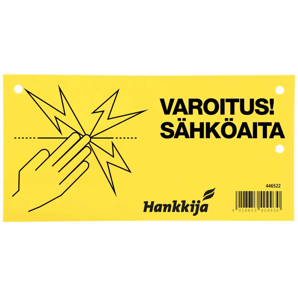Kestävä, muovinen varoituskyltti sähköaitaukseen. Määräysten mukaisesti kaikkien teiden tai muiden yleisten kulkureittien varrella sijaitsevissa sähköaidoissa on oltava sähköiskun vaarasta varoittavat varoituskyltit. Voidaan ripustaa aitaan esim. nippusiteillä.