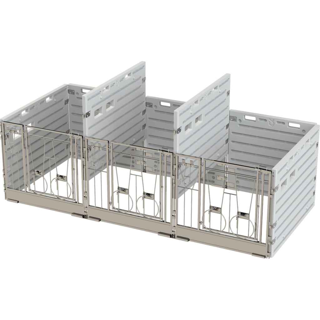 Uudet muunneltavat vasikkakarsinat tarjoavat joustavan ja tehokkaan ratkaisun vasikoiden kasvatukseen. Vasikkakarsinat voidaan kasata vapaasti seisoviksi tai kiinnittää seinään. Paneelit on nopea ja helppo koota yhden henkilön toimesta, ja niistä voidaan muodostaa yksi tai useampia karsinoita. Voit aloittaa yksittäiskarsinoilla ja muodostaa helposti pienryhmiä poistamalla vierekkäisten karsinoiden väliseinät. Purkaminen ja puhdistus on yhtä nopeaa ja helppoa. Paneelien kahvat ovat riittävän suuret trukkipiikeille ja paneelien pinnat on helppo puhdistaa. Vasikkakarsinoiden osat myydään erikseen, joten voit suunnitella ja toteuttaa juuri omiin tiloihisi ja tarpeisiisi sopivan kokonaisuuden!
