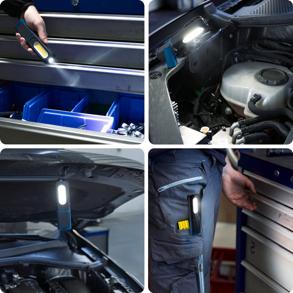 Tekniset tiedot: Valoteho: 350 lumenia (COB-LED). 2 valonlähdettä: työvalo ja taskulamppu. 360° kääntyvä runko ja 180° taittuva jalusta. Vahva magneetti, ripustuskoukku ja vyöklipsi. Käyttöaika jopa 7 tuntia (3.7V / 1200mAh Li-Po sisäänrakennettu akku). Kestävä (iskunkestävyys IK05, suojausluokitus IPX3). USB-C lataus. Mukana USB-johto.