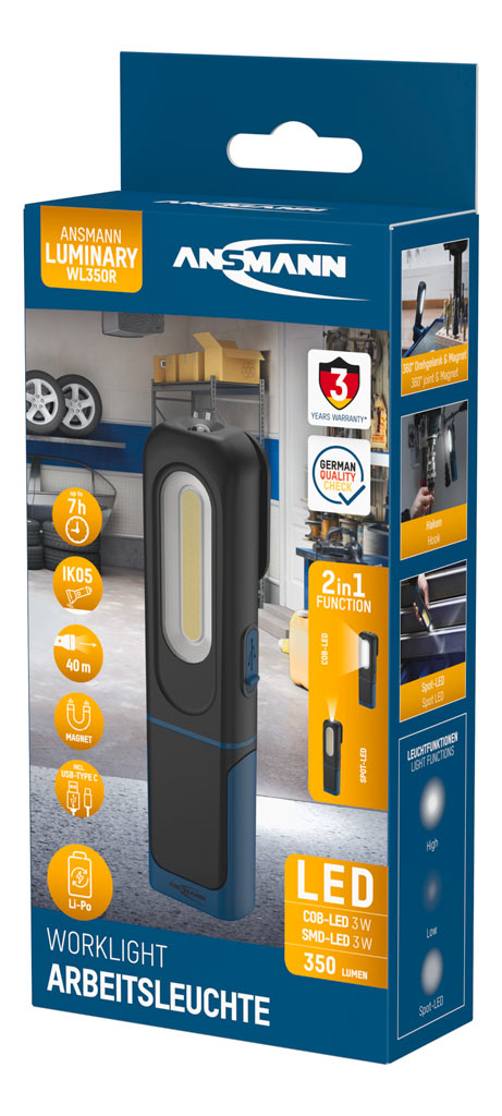 Ansmann WL350R on kätevä, laadukas ja monipuolinen ladattava työvalo, joka toimii erinomaisesti niin kohde/yleisvalona kuin tarkkana taskulamppunakin. Sen järkevä ja ohut muotoilu yhdistettynä magneettijalkaan, ripustuskoukkuun sekä vyöklipsiin tekee siitä täydellisen työkalun kaikkiin tilanteisiin, joissa tarvitset kädet vapaaksi. Tämä pitkäikäinen ja luotettava valaisin on suunniteltu ammattilaisenkin vaativaan arkeen ja se soveltuu upeasti esimerkiksi korjaamolle, rakennustyömaalle tai asennustöihin.