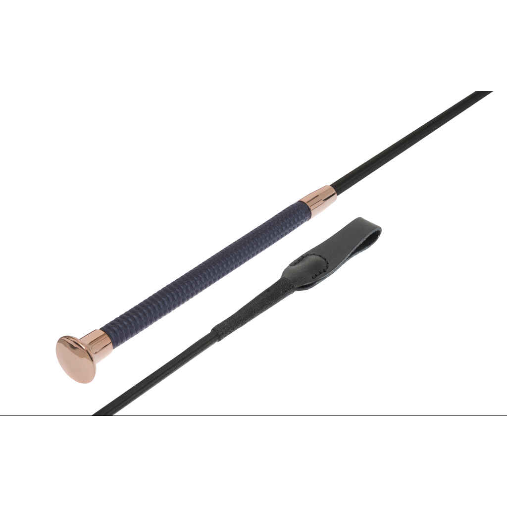 Wahlstenin Gisela yleis- ja esteraippa on elegantti valinta! 65cm pituisessa raipassa on ruusukultainen nuppi sekä tummansininen, metallinhohtoinen kädensija. Raipan päässä on pieni käsilenkki.