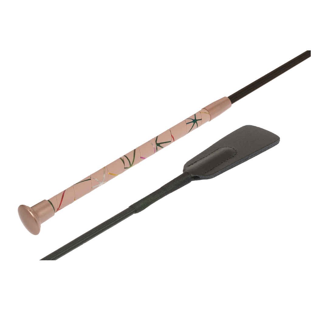 Ihastuttavan Wahlsten Joy yleis- ja esteraipan kädensijassa on värikäs kuviointi. Elegantti metallinhohtoinen nuppi on yhteensopivaa sävymaailmaa kädensijan kanssa. Joy raipassa on musta varsi ja se on 65 cm pitkä.