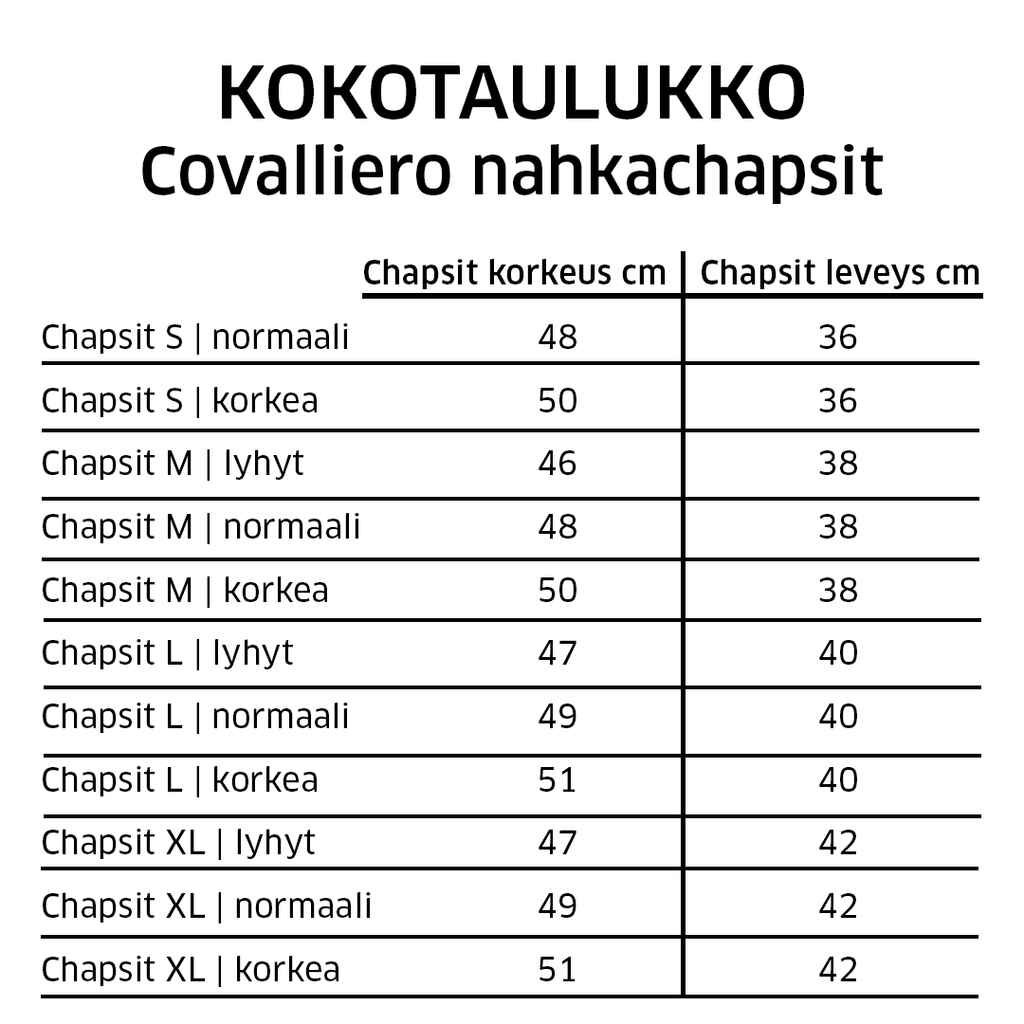 Covallieron laadukkaat chapsit on valmistettu aidosta nahasta. Huolellisesti suunnitellut polvimittaiset chapsit istuvat ylle mukavasti ja ovat täydellinen valinta heille, jotka arvostavat ratsastussaappaan tuomaa tuntua ja toisaalta jodhpurien vapautta. Joustopaneelit chapsien takaosassa varmistavat liikkumisvapauden ja joustava jalkalenkki pitää chapsit tukevasti paikoillaan.