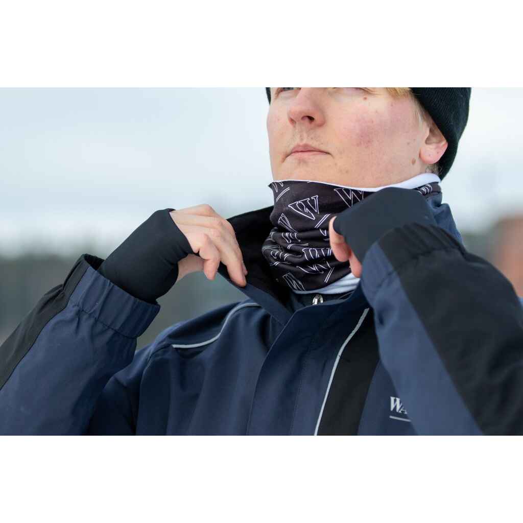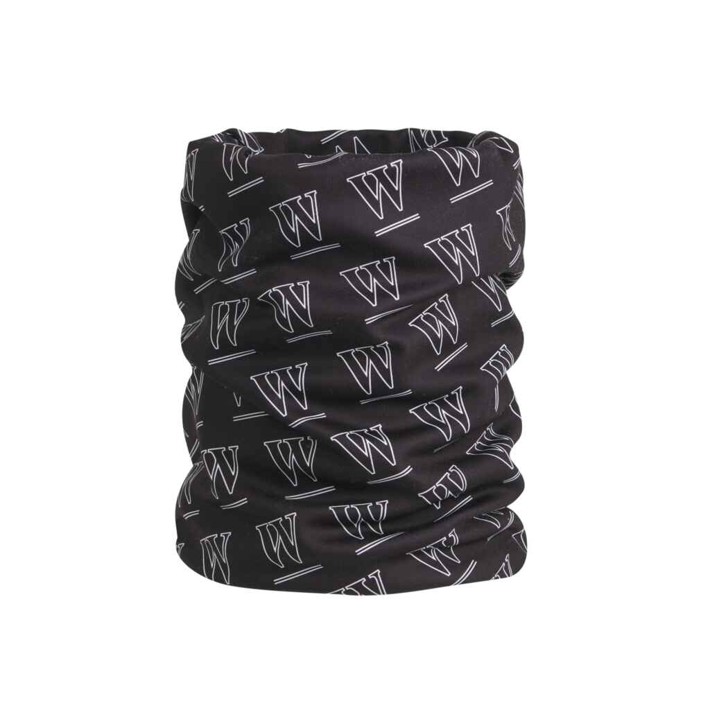 Lämmin tuubihuivi on monikäyttöinen lisä pukeutumiseen. Mustassa huivissa on valkoinen Wahlsten-logokuviointi.