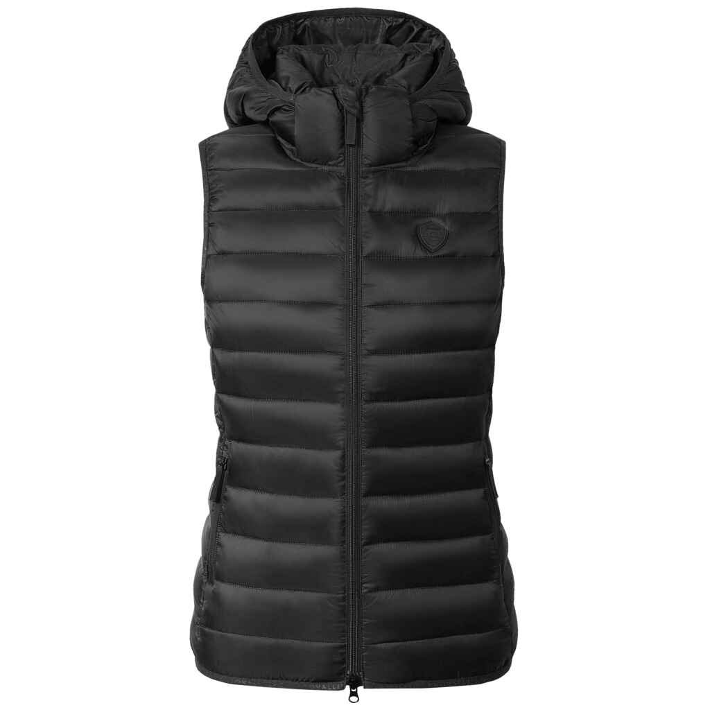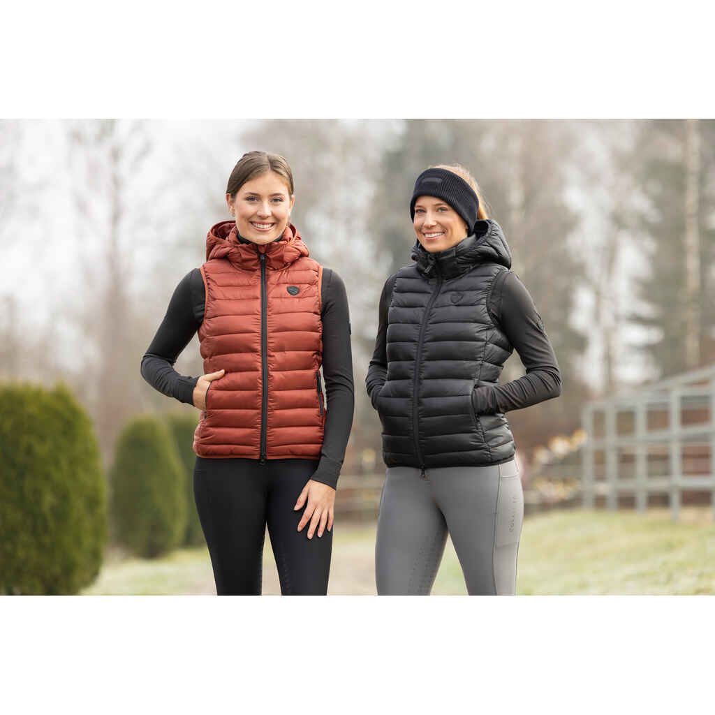 Tässä toppaliivissä on näppärä kaksisuuntainen vetoketju sekä kaksi vetoketjullista taskua liivin etupuolella. Liivin huppu on irrotettavissa tai kiinnitettävissä liivin niskaosaan, jolloin se ei häiritse ratsastettaessa. Helma, kädentiet sekä hupun reunus kantattu joustavalla, tyylikkäästi logokirjaillulla kanttinauhalla. Tyylikäs ja tyköistuva malli luo naisellisen silhuetin.