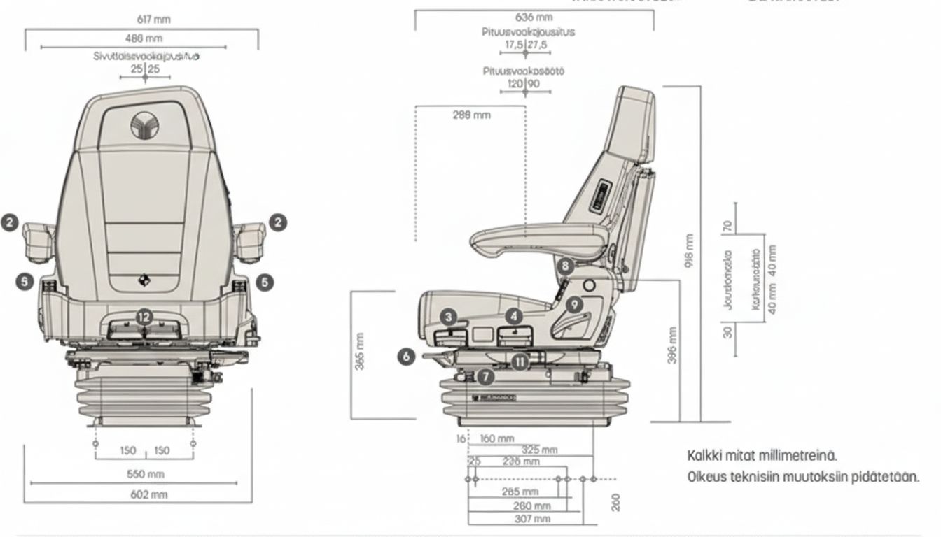 Grammer Maximo Evolution Dynamic on ilmajousitettu premium-kuljettajanistuin raskaampiin traktoreihin. Dynamic Damping System (DDS) vähentää tärinää ja kuormitusta, ja automaattinen painonsäätö hoitaa mukavuuden kohdilleen (50–130 kg). Dualmotion-selkänojan tuki mukautuu kuljettajan liikkeisiin ja aktiivinen istuimen ilmastointi parantaa työskentelymukavuutta.